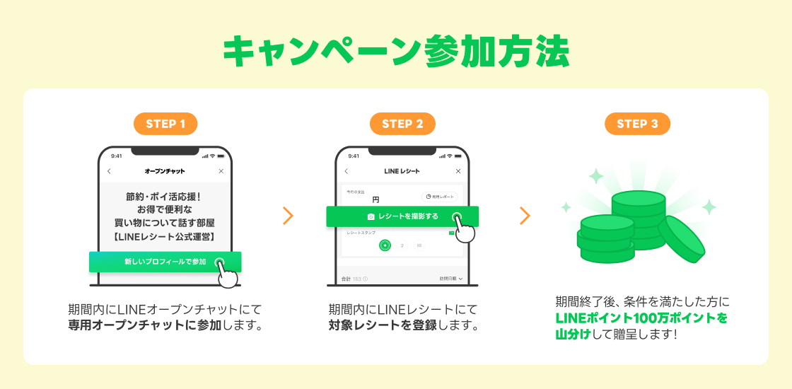 キャンペーン期間内に、「LINEレシート」にてスーパーやドラッグストアなどの対象レシートを登録