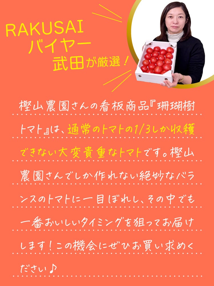 楽彩株式会社(本社:東京都足立区/代表取締役社長:大﨑善保)は、2025年3月17日(月)より徳島県 樫山農園さんが育てた『珊瑚樹トマトS特選』を30セット限定にて予約販売をスタートいたします。ひとつひとつ糖度センサーにて糖度を計測して等級を分け、糖度10度以上の選び抜かれたものだけを産地から直接お届けいたします。楽彩のバイヤーおすすめのフルーツトマトをぜひご賞味ください。