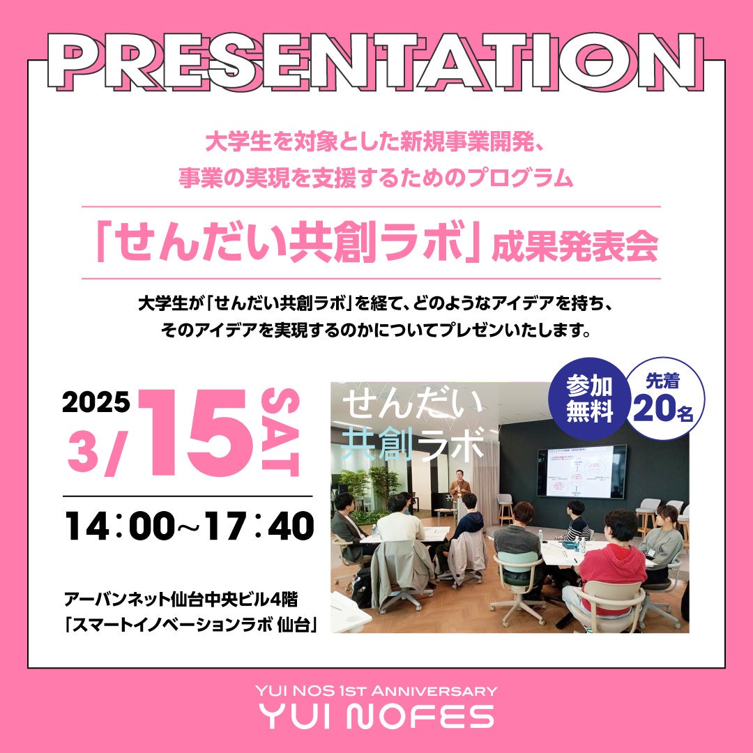 大学生を対象とした新規事業開発、事業の実現を支援するためのプログラム「せんだい共創ラボ」の成果発表会を開催いたします。大学生がこのプログラムを経て、どのようなアイデアを持ち、そのアイデアを実現するのかについてプレゼンいたします。