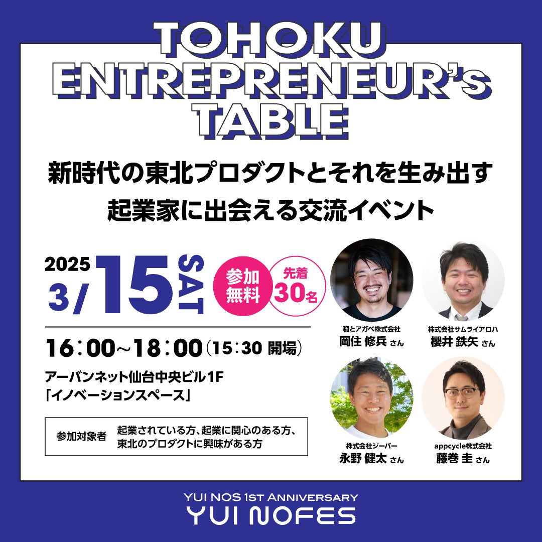 東北で革新的プロダクトを生み出す起業家に会ってみませんか?イベント前半は、東北で活躍する起業家によるプロダクトストーリーについてお話しいただきます。後半は、実際にテーブルを囲んで起業家の方々と交流できるイベントとなっております。