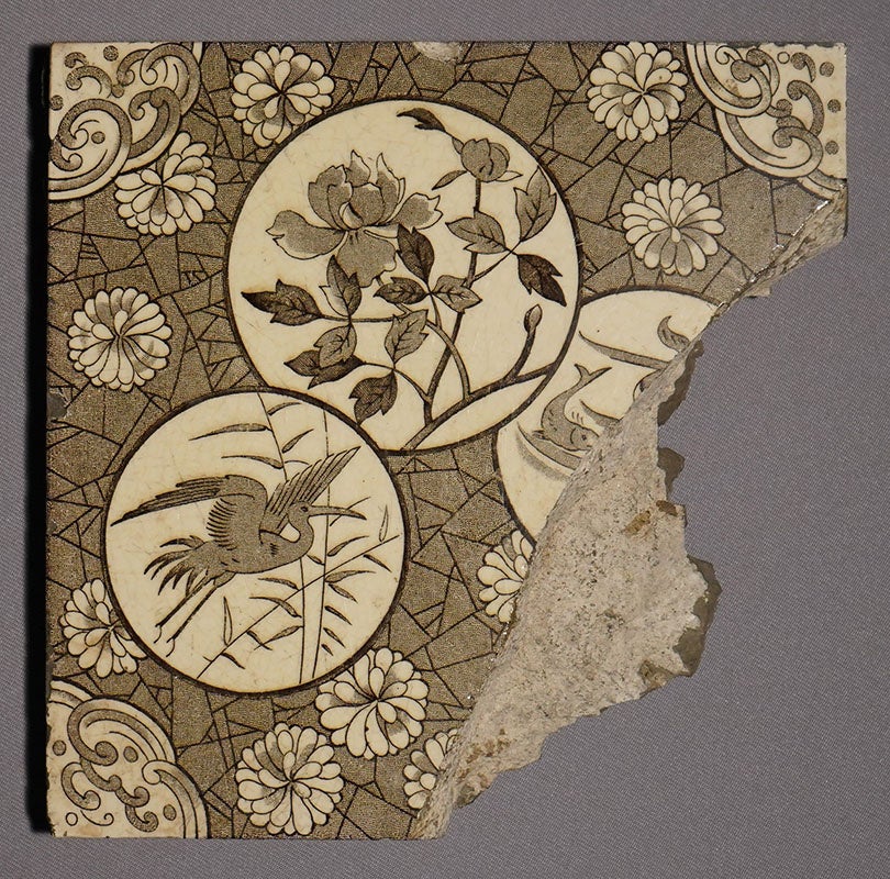泉布観の各部屋にはデザインの異なる8つの暖炉が設置されています。本品は明治22年(1889)頃の増築工事で新設された2階北西室暖炉の装飾タイルです。イギリスの陶磁器メーカーMINTON社で生産されたタイルで、氷がひび割れたような幾何学模様を背景に、花・鳥・魚(欠損)を描く東洋風のデザインは、19世紀後半にヨーロッパで流行したジャポニズムの影響がみられます。