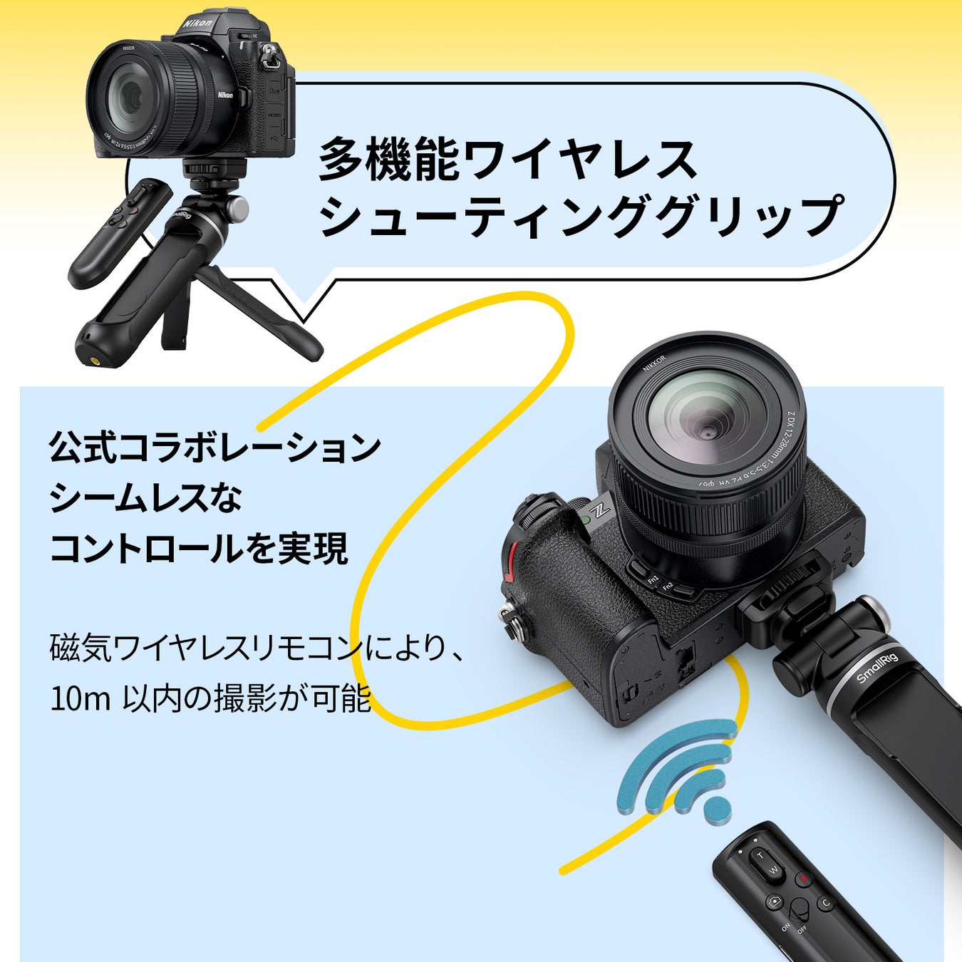 今後発売予定の多機能ワイヤレスシューティンググリップは、シームレスなコントロールを実現します。磁気式ワイヤレスリモコンにより、10m以内の撮影が可能となります。長さと角度は調整可能で、さまざまな撮影ニーズに柔軟に対応できます。また、足を展開すると三脚に変身します。