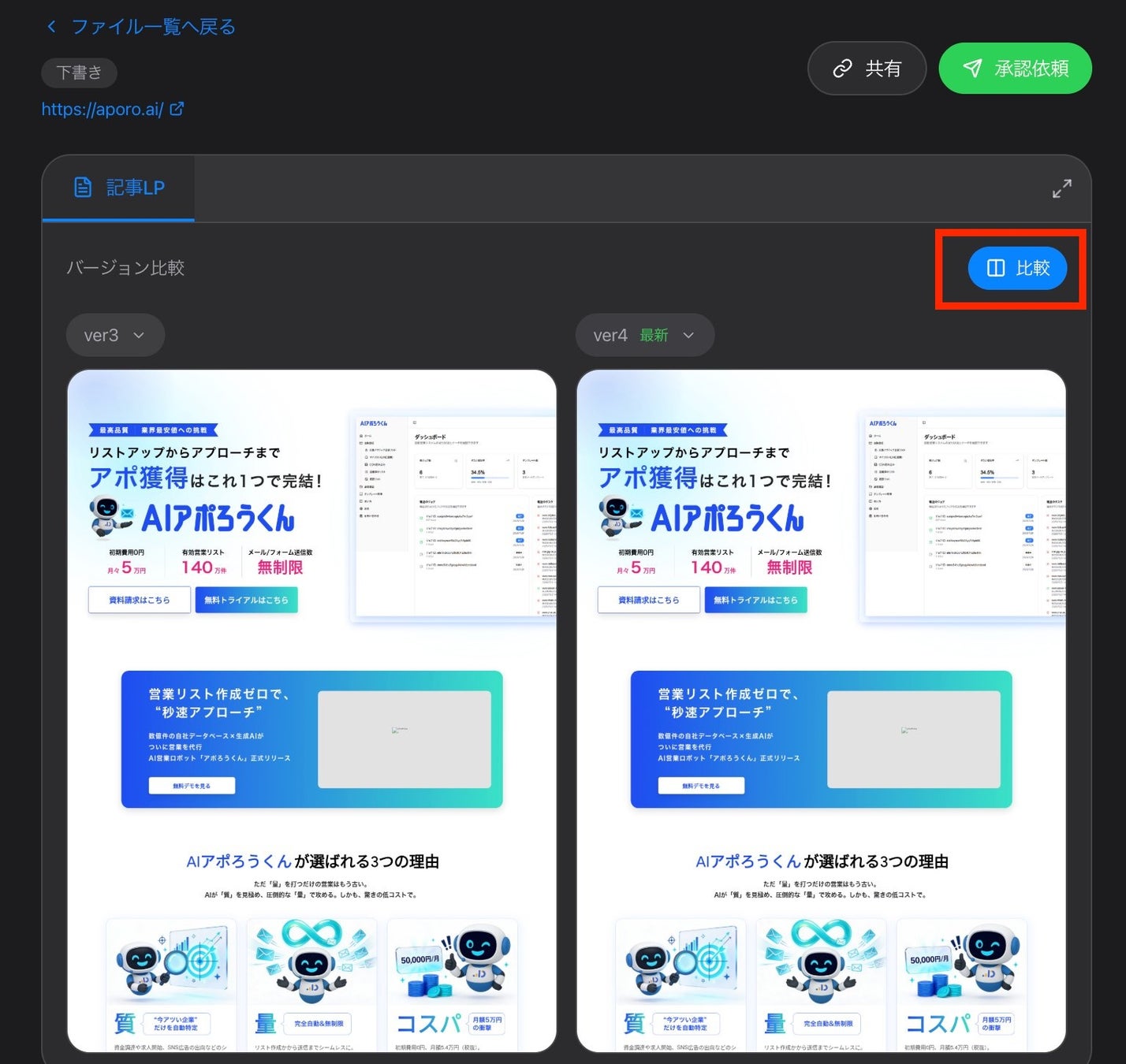 修正前後のCRを並べて比較する機能を搭載。動画は同一タイムコードでの並列再生が可能で、修正の反映漏れや意図しない変更を一目で発見できます。