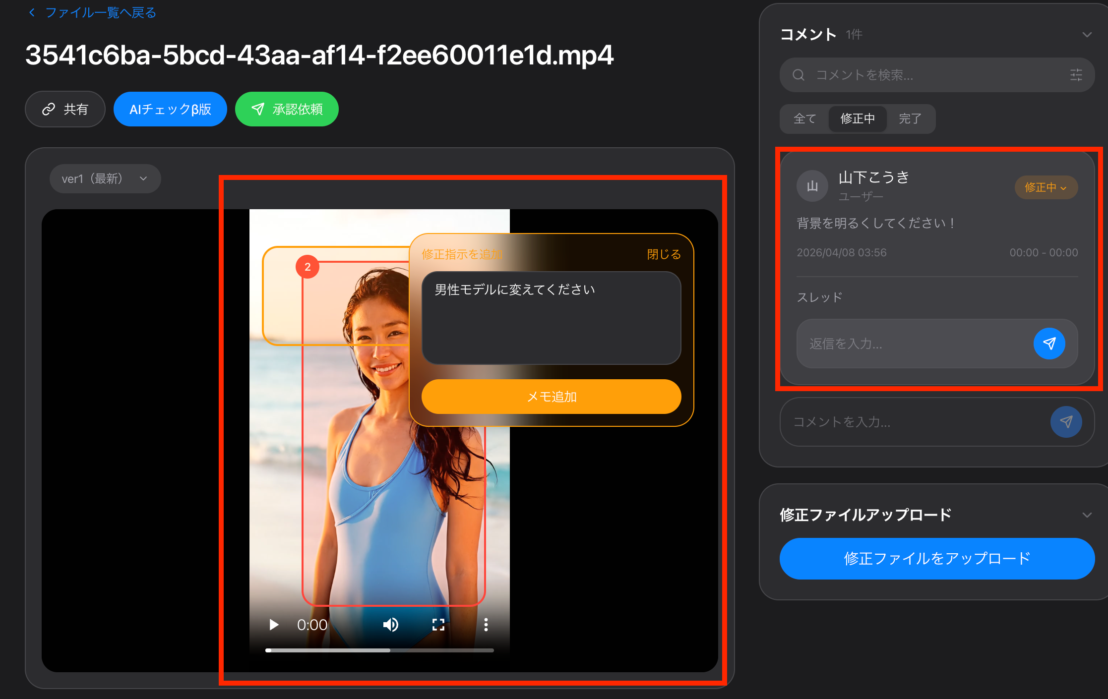 具体的には、修正指示がメール・チャット・スプレッドシートなどに分散し、「誰がいつどの指示を出したか」が追えなくなる問題。特に動画CRでは「何分何秒のこのカットを直してほしい」という指示をテキストだけで伝えるのは難しく、認識のずれが修正回数を増やす原因になっていました。