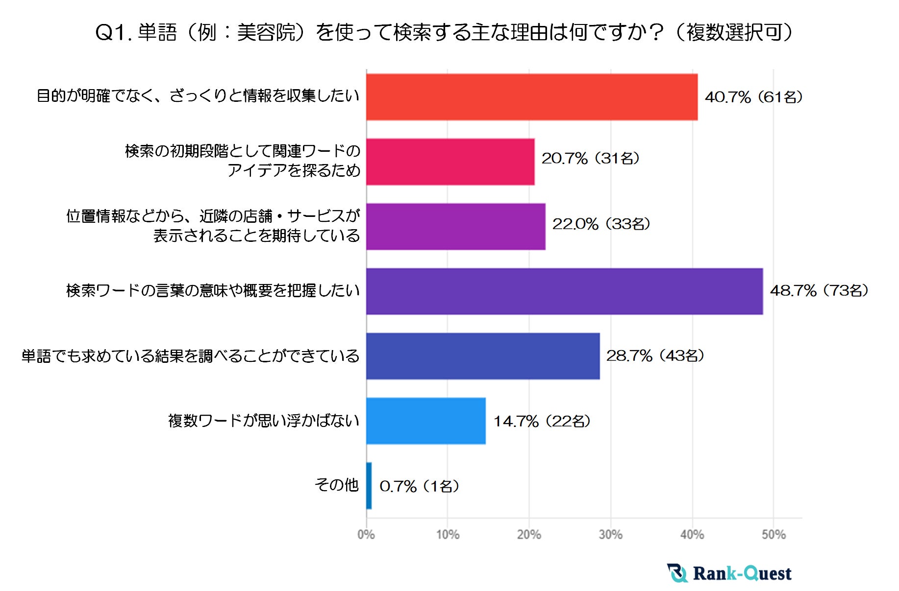 また、「単語だけでは求める情報が得にくい」と感じている方が18.7%(28名)おり、単一のワードでは情報が不足し、複数ワードで絞り込む必要があると考えていることが分かります。