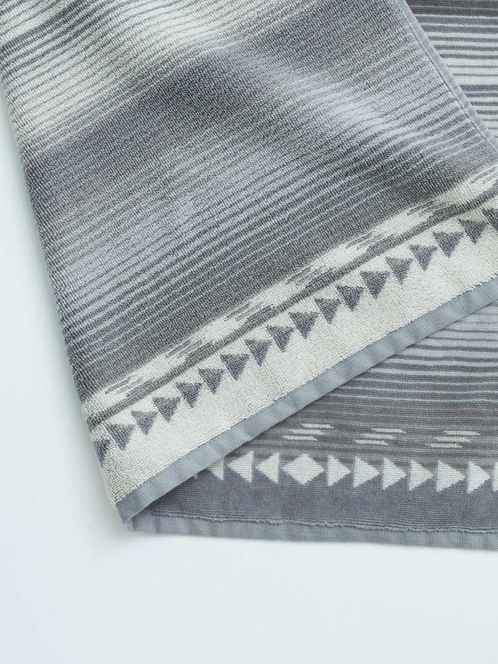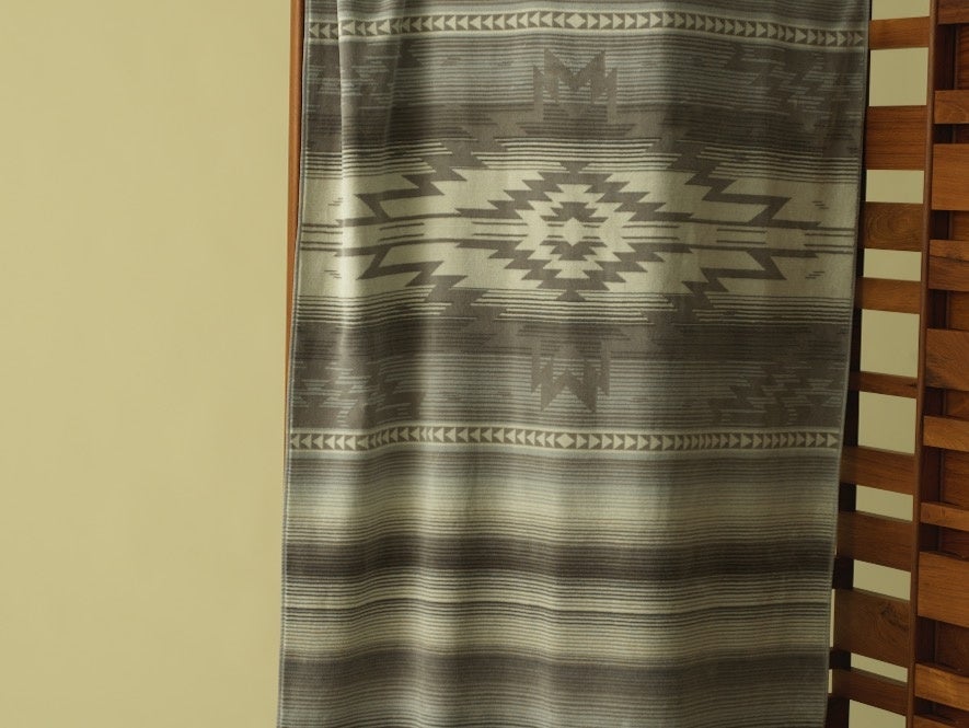 Saltillo Sunsetの柄はメキシコ・サルティーヨの賑わいを想起させる中央の三角形、階段、矢印の帯と、その両側にはチワワン砂漠の印象的な夕日を反映し冴えわたるオンブレ(陰影や濃淡)が描かれています。表はベロア調、裏はループで肌触りも良くマルチにお使いいただけるタオルブランケットです。