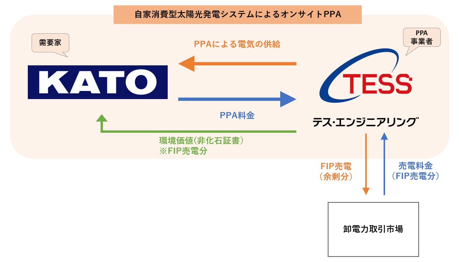 テスホールディングス株式会社(本社:⼤阪市淀川区、代表取締役社⻑:山本 一樹、以下「当社」)は、連結⼦会社であるテス・エンジニアリング株式会社(本社:⼤阪市淀川区、代表取締役社⻑:髙崎 敏宏、以下「テス・エンジニアリング」)が、株式会社 加藤製作所(本社:東京都品川区、代表取締役社長:加藤 公康、以下「加藤製作所」)の群馬工場向けに、オンサイトPPAモデル※1を活用した自家消費型太陽光発電システムによる再生可能エネルギー電気の供給(以下「本事業」)を行うことが決定いたしましたので、お知らせいたします。本事業による再生可能エネルギー電気の供給は、2026年2月から開始予定です。