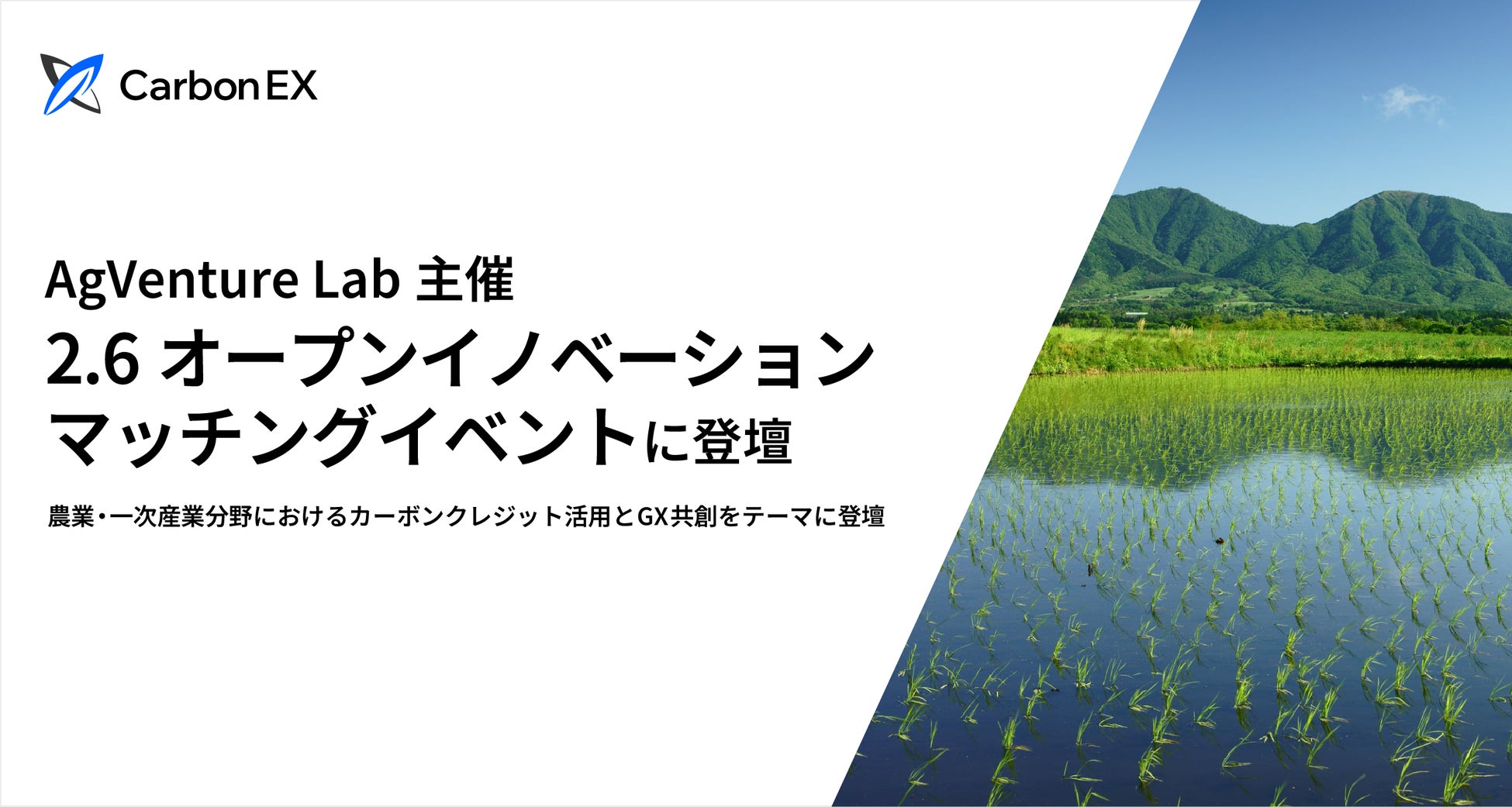 Carbon EX株式会社(本社:東京都港区、代表取締役: 西和田浩平、竹田 峻輔、以下「当社」)は、2月6日(金)に一般社団法人AgVenture Labが開催する「2.6オープンイノベーションマッチングイベント」において、当社Co-CEOの陰山 貴之がピッチ登壇するとともに、ブースを出展します。