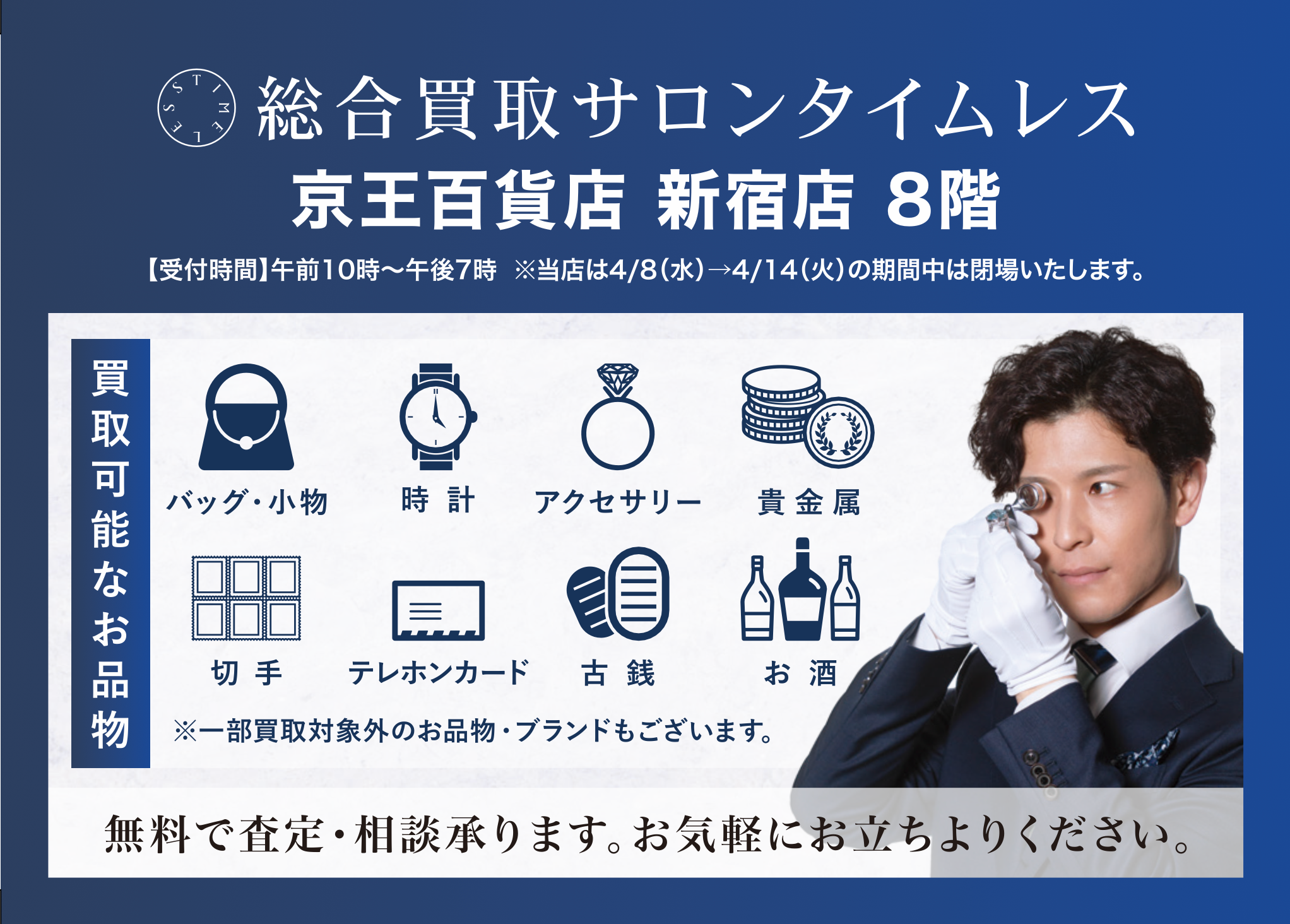 総合リユースサービス(オークション・総合買取サロン・古物商プラットフォーム)を展開する、株式会社タイムレス(本社:東京都港区、代表取締役社長:馬場 浩太)は、「総合買取サロン タイムレス 京王百貨店 新宿店」を京王百貨店 新宿店8階イベントスペースにて期間限定で出店しております。出店期間は2026年2月8日(日)~7月31日(金)の予定です。※4月8日(水)~4月14日(火)を除く。