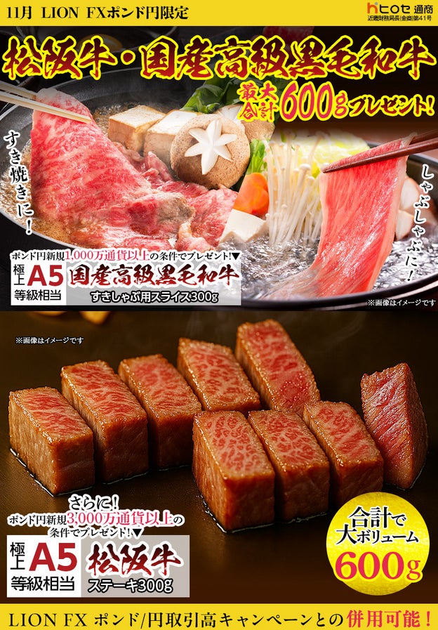 ヒロセ通商株式会社 (本社:大阪府西区、代表取締役:野市 裕作、以下:当社)は、当社の提供する「LION FX」において、2025年11月3日(月)より、「LION FXポンド円限定 松阪牛・国産高級黒毛和牛最大600gプレゼントキャンペーン」を実施することをお知らせいたします。