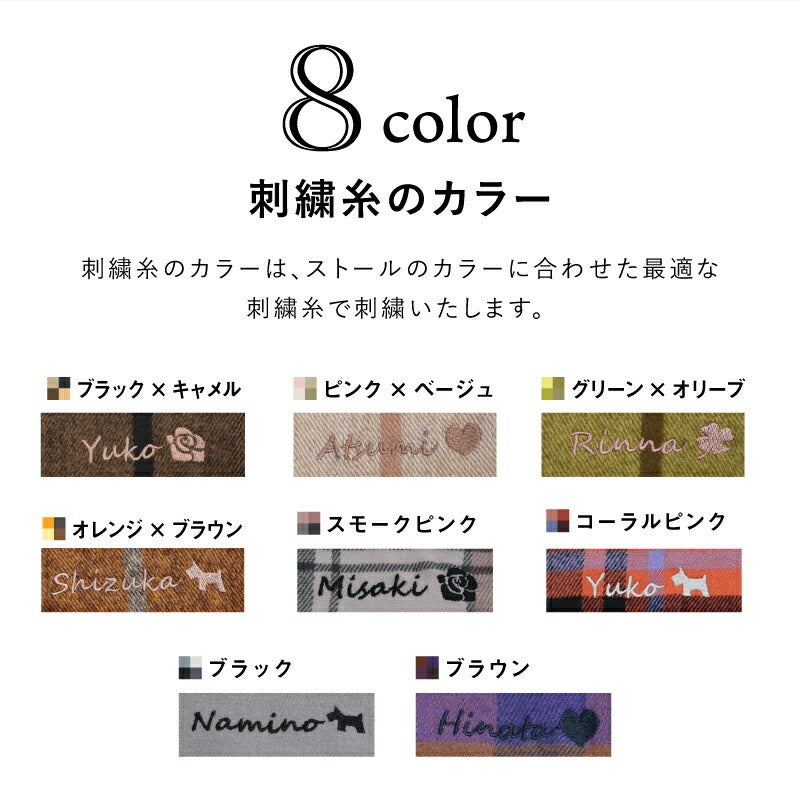 「Okulu」限定の刺繍サービスでは、ストールのカラーに合わせた糸色で名入れを施します。