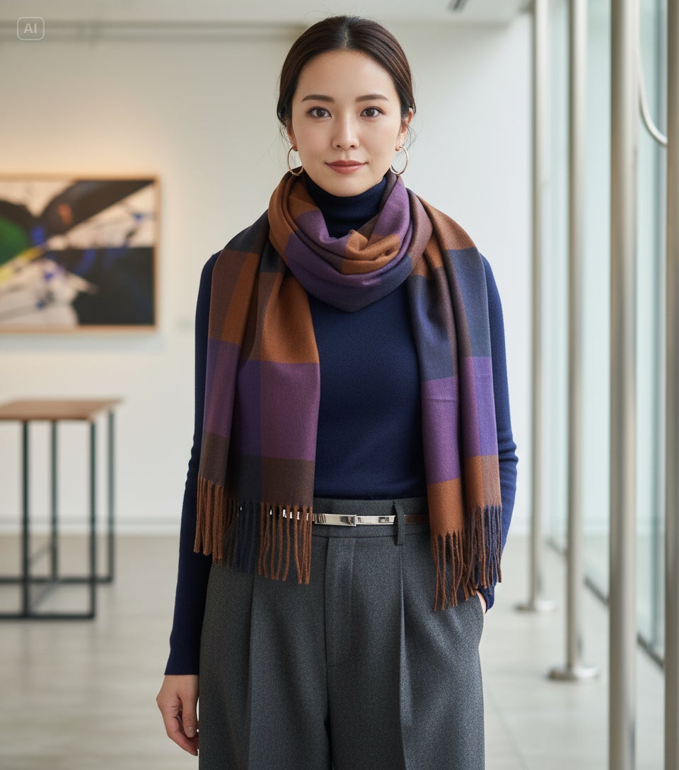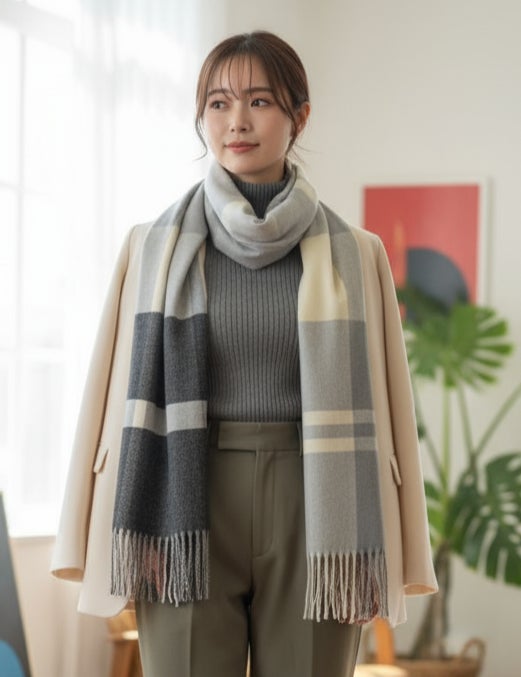 まるでカシミヤのようなふんわりとした肌触りと、上品なチェック柄が特徴。