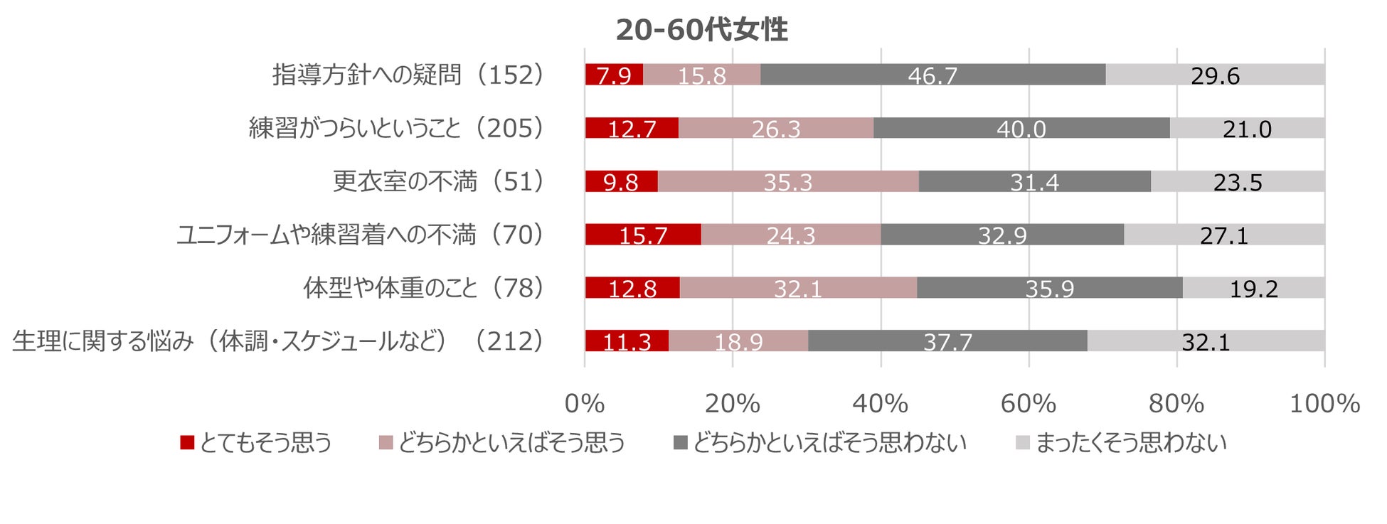 女子高校生の子を持つ保護者からは、スポーツ活動における要望として「生理や体調不良時の対応について、もっと柔軟に対応してほしい」(35.7%)、「女性の指導者をおいてほしい」(22.8%)、「下着等が透けないように白いユニフォームを変えてほしい」(17.0%)などの声が挙がりました。 高校年代の女子スポーツ指導者からも、「女性指導者やOGと相談できる環境を充実させたい」(26.6%)、「更衣室を充実させたい」(22.4%)など、環境改善への強い意欲が示されました。