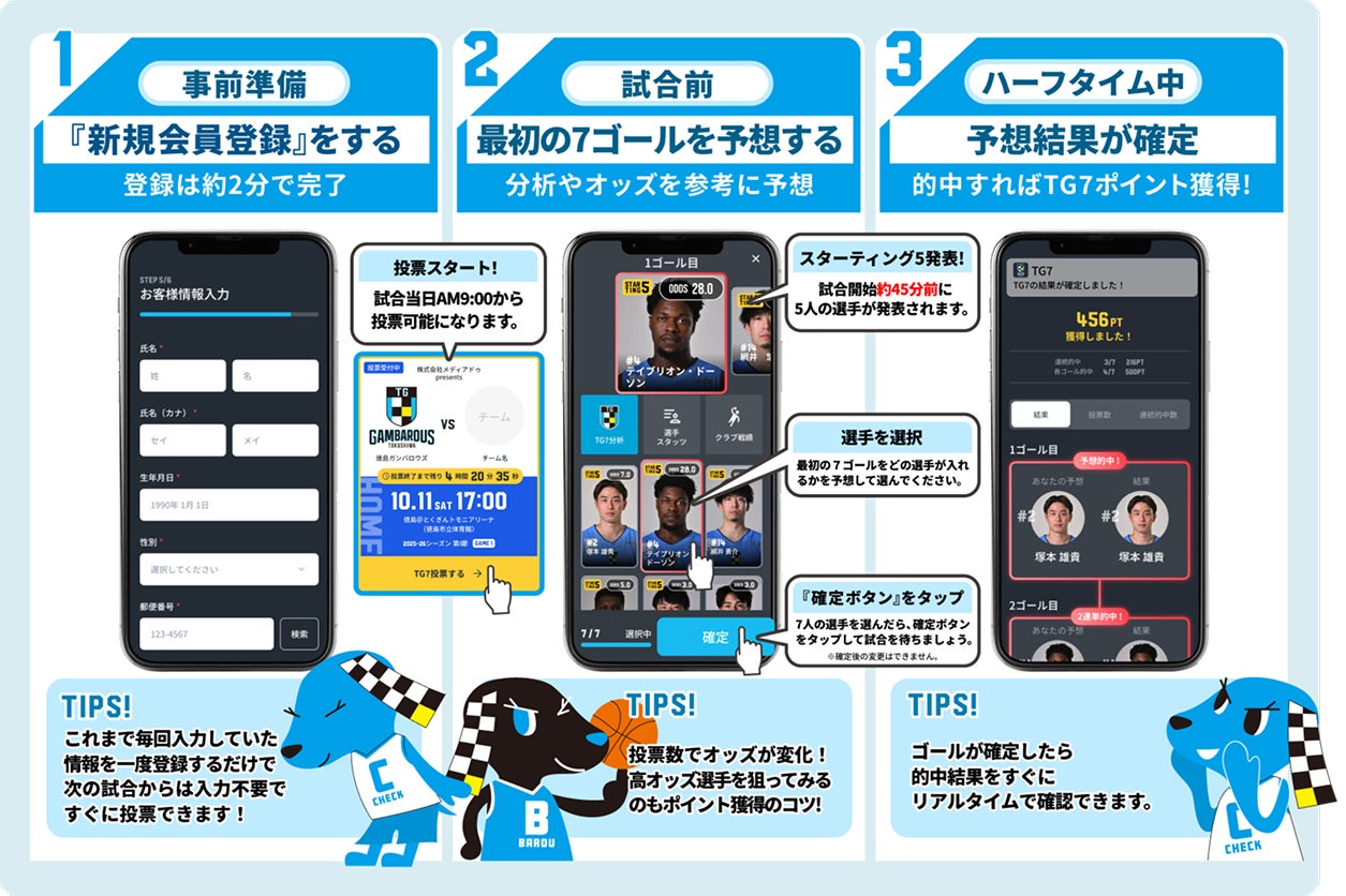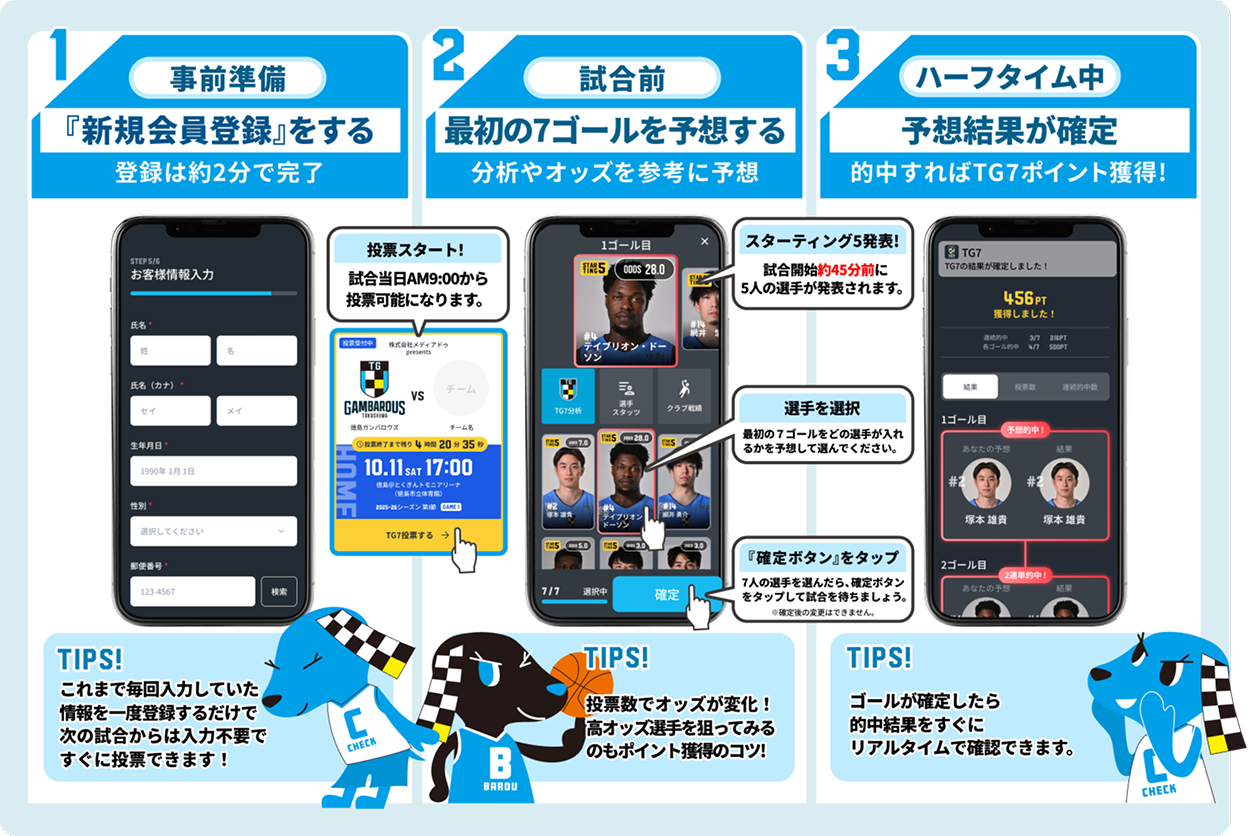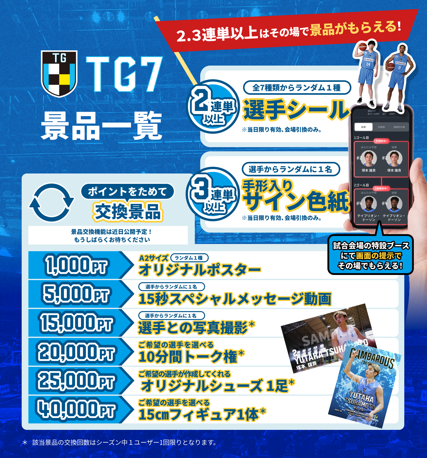 予想結果はハーフタイム中に確定します。 的中した数に応じてTG7ポイントが加算され、獲得したTG7ポイントは景品と交換できます。(※交換機能は後日リリース予定)。