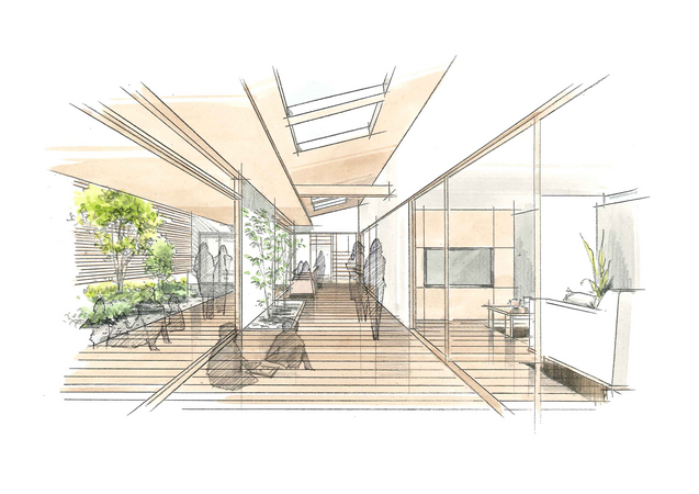 広々とした「縁」を住まいの中央に配し、空間を仕切る障子戸を全て壁の中に収納することで“続き間”となるLDKから中庭まで、視線が一気に抜けるダイナミックな大空間を実現します。勾配天井が寛ぎ感をより際立たせ、無垢材の床や板張りの天井等、自然素材をふんだんに使用した内装も、居心地の良さを高めます。来客時や食事時等は障子戸やサッシを閉じて、LDKと「縁」をそれぞれ独立した空間にする等、生活シーンに対応する可変性も魅力です。