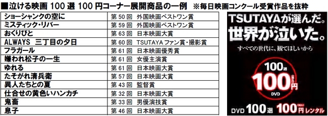 なお、全国のTSUTAYA店頭では、毎日映画コンクールの過去受賞作品など名作の数々を取り揃えた「泣ける映画100選100円コーナー」を展開しています。来年1月下旬の大賞含めた各賞発表までのあいだ、過去の毎日映画コンクール受賞作品をTSUTAYA店頭にてお楽しみください。