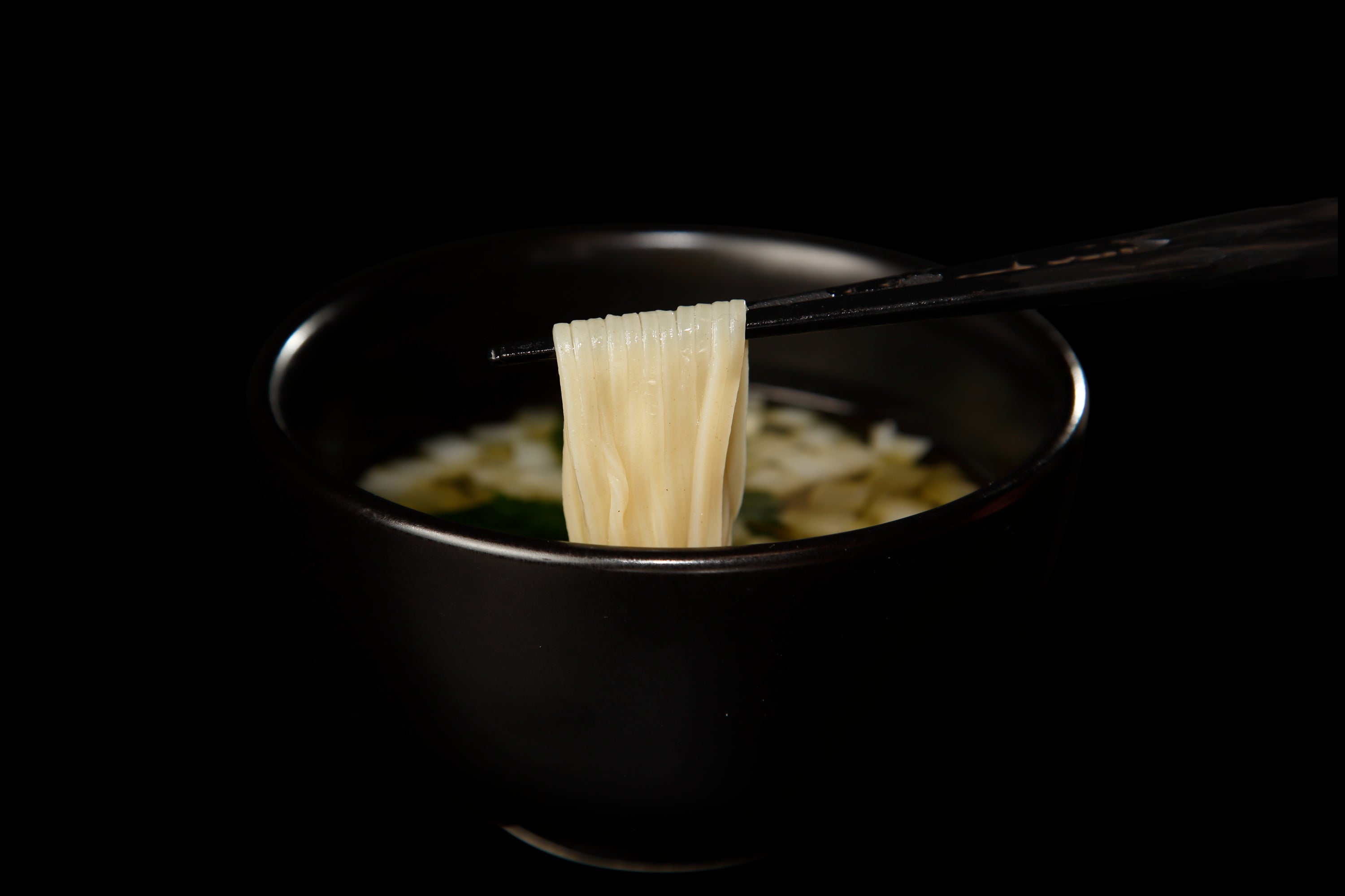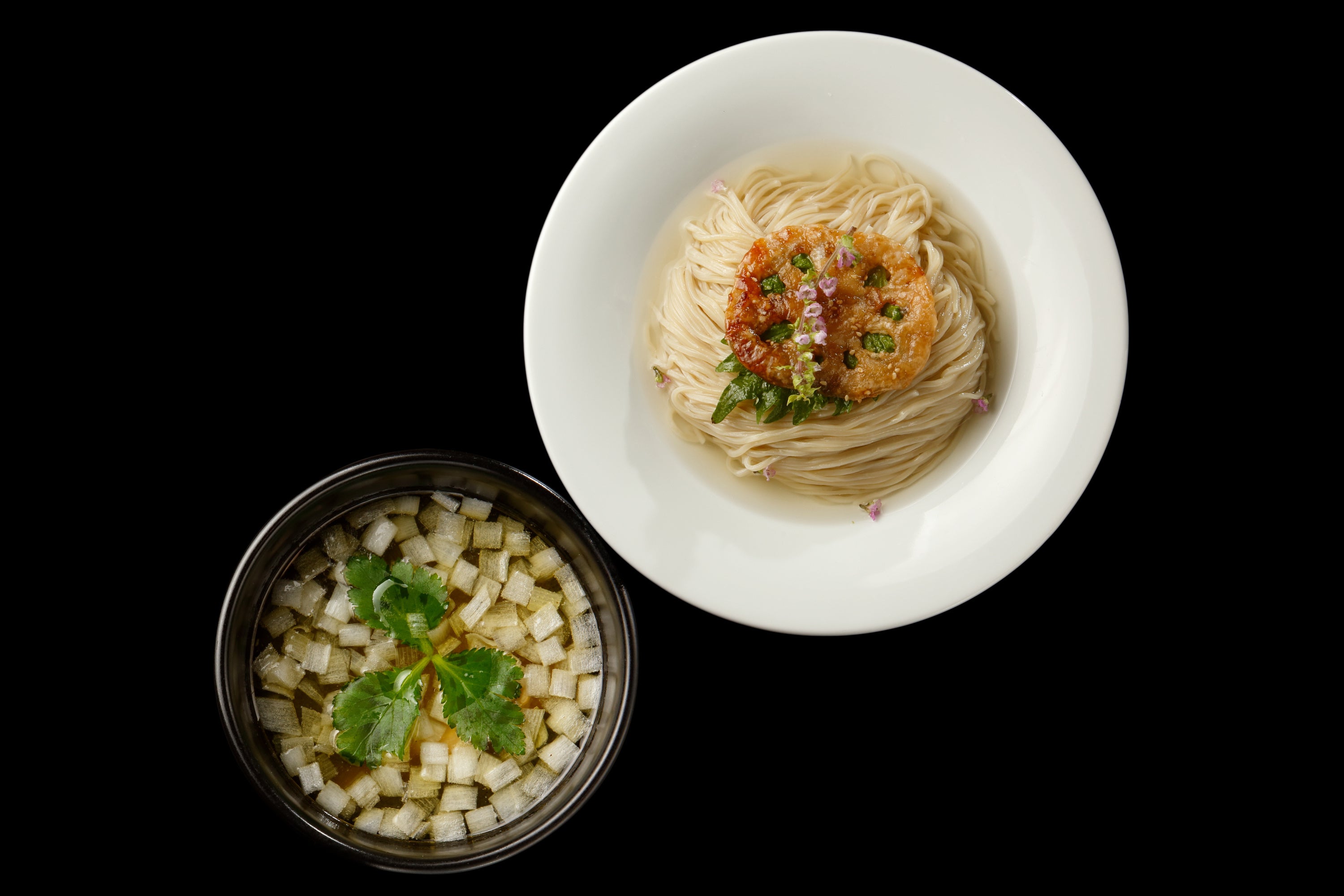 銘柄鶏を中心にサバやカツオ、アジなどの節から出汁をとった和風醤油味のつけ汁は、滋味深く上品な味わい。合わせる麺は、香り高い国産小麦「春よ恋」などを使用した自家製平打ち麺。ガゴメ昆布、利尻昆布、羅臼昆布の3種を使用した旨味あふれる昆布水をまとわせることで、小麦の豊かな風味と歯切れのよい食感がより際立ちます。麺を食べ終えたあとに残った昆布水は、スープに加えることで最後まで余すことなくお楽しみいただけます。