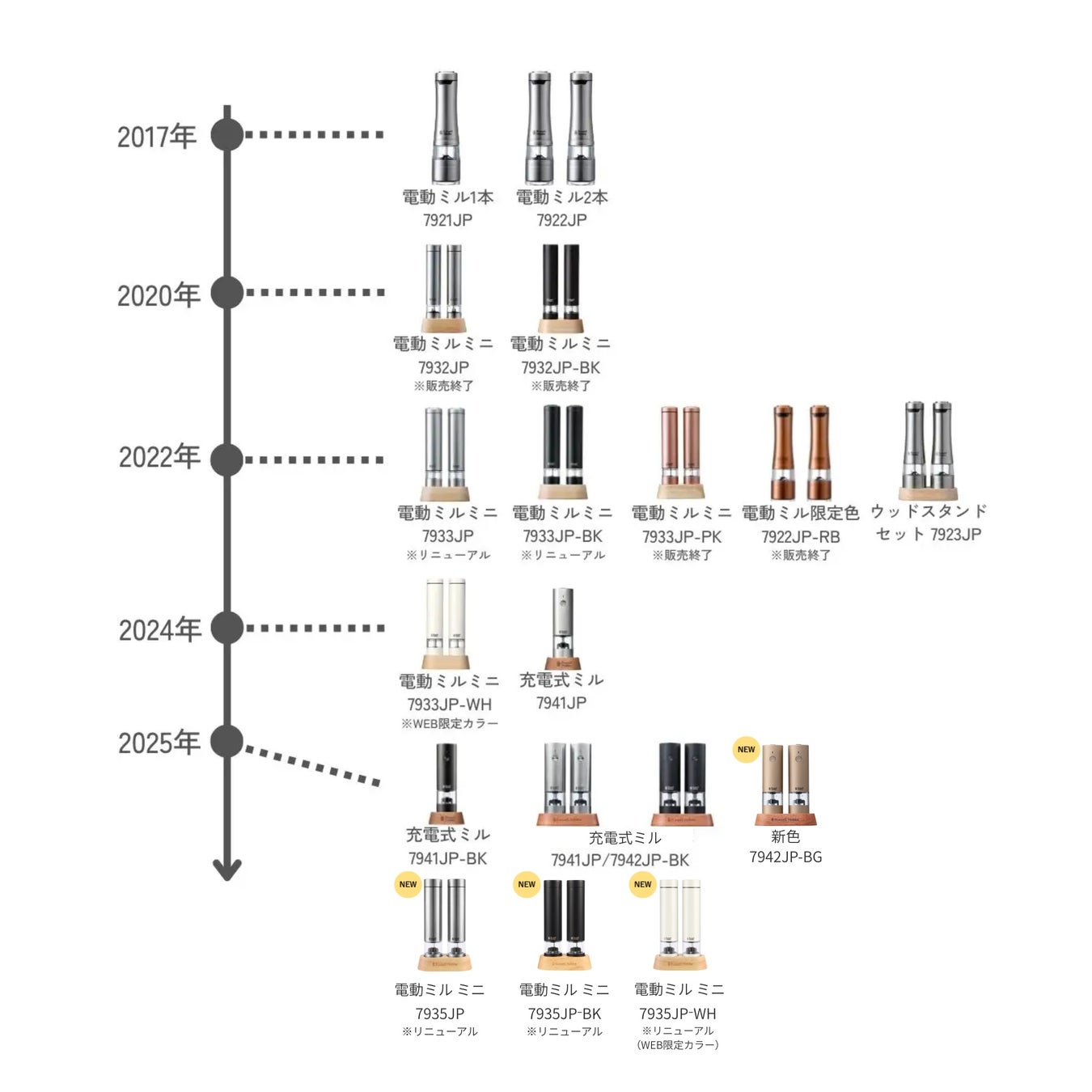 本製品は、現行製品「電動ミル ソルトアンドペッパー ミニ(7933JP/7933JP-BK/7933JP-WH)」をバージョンアップした商品になります。