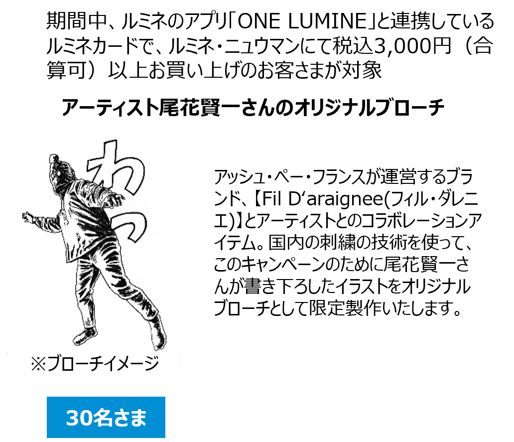 期間中、ルミネのアプリ「ONE LUMINE」と連携しているルミネカードで、ルミネ・ニュウマンにて税込3,000円(合算可)以上お買い上げのお客さま