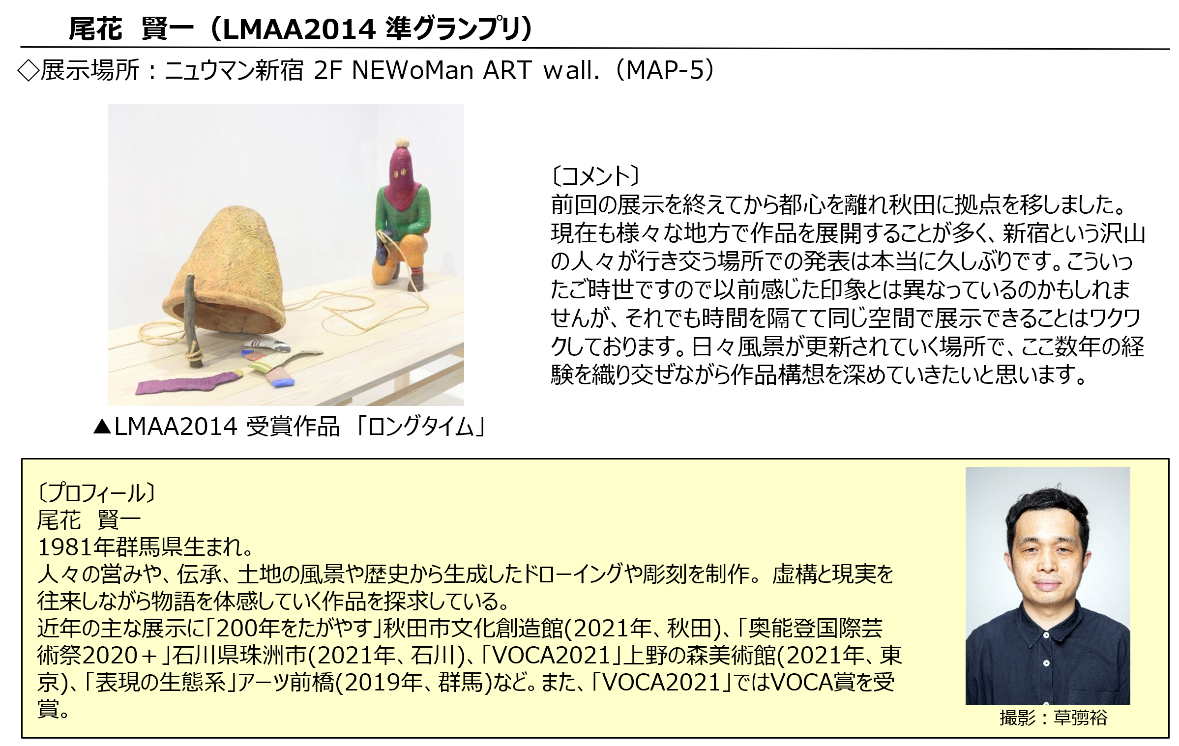 参加アーティストには、「LMAA2014 準グランプリ」で「VOCA展2021 VOCA賞」を受賞した尾花賢一さんや「LMAA2016 グランプリ」でニューヨークで活動しているHarumi Oriさんなど6名のアーティストが参加し、5月26日(木)~6月15日(水)の期間、ルミネ・ニュウマン各所のウィンドウを彩ります。