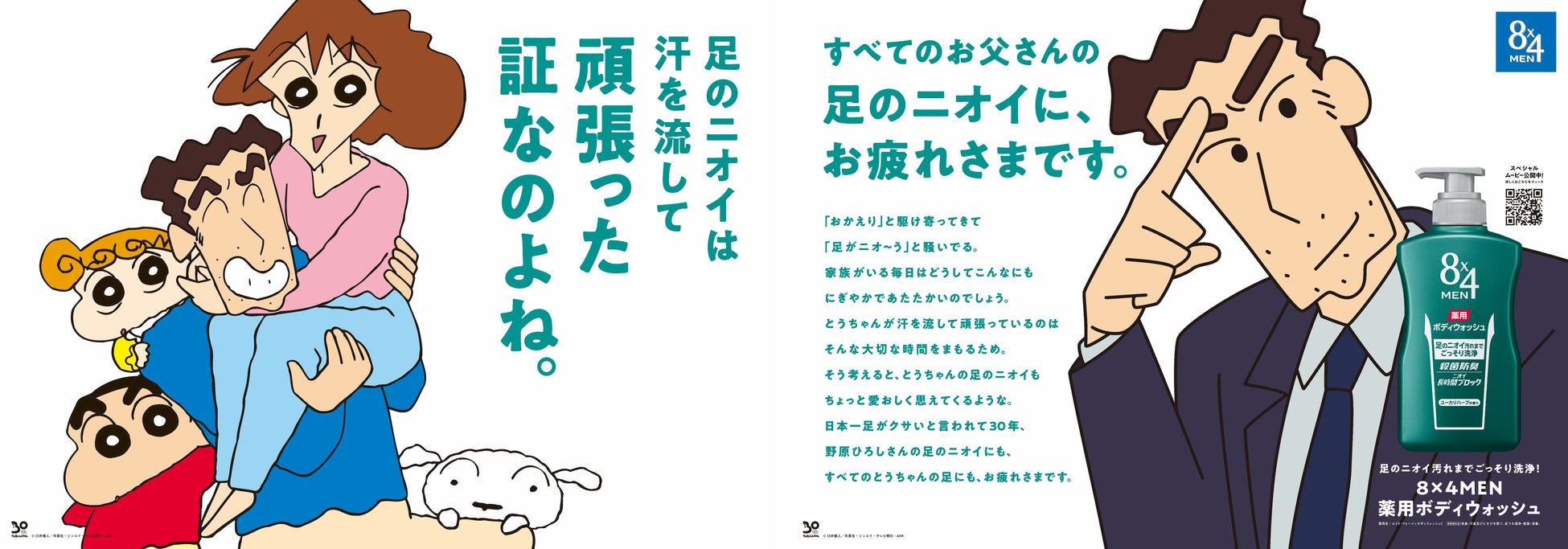 仕事を終えて帰宅したひろしは、その足のニオイにしんのすけに「今日も足クサ絶好調」と言われてしまう。そんなひろしにみさえが手渡したのが「8x4MEN 薬用ボディウォッシュ」。これを使って洗ったひろしの足はお風呂上りには「とーちゃんの足じゃないみたい」と言われるほど臭いのないスッキリとした足に。