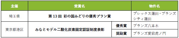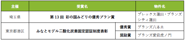 埼玉県蓮田市で特定建築者として携わった再開発事業の分譲マンション「プレックス蓮田・ ブランズシティ蓮田」が「第13回彩の国みどりの優秀プラン賞 」、東京都港区で開発した分譲マンション「ブランズ六本木」「ブランズ愛宕虎ノ門」の2物件が「みなとモデル二酸化炭素固定認証制度表彰」にて優秀賞、奨励賞を受賞いたしました。