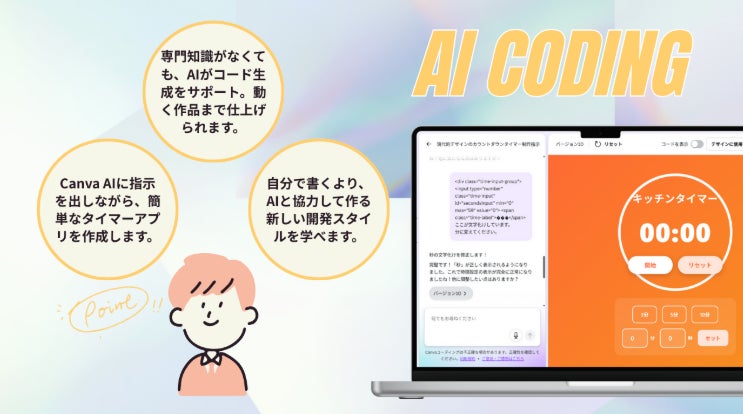 Canvaの生成AIに自然言語で指示を出しながら、簡単なタイマーアプリを完成させる90分のワークショップです。プログラミング未経験者にも分かりやすいステップで構成されており、学生から大人まで、生成AIを使ったものづくりに挑戦したい方に幅広くご参加いただけます。