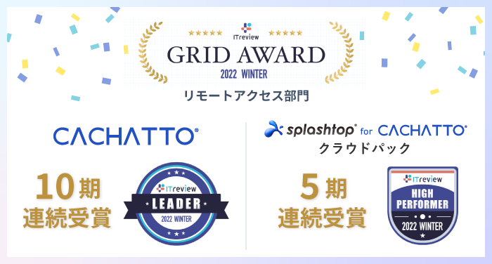 e-Janネットワークス株式会社(本社:東京都千代田区、代表取締役:坂本史郎 / 以下、e-Janネットワークス)が提供するテレワークプラットフォーム「CACHATTO®」(以下、CACHATTO)が、アイティクラウド株式会社主催の「ITreview Grid Award 2022 Winter」のリモートアクセス部門において、満足度、認知度ともに優れた製品として「Leader」に選出されました。リモートアクセス部門における「Leader」受賞は10期連続となります。また、当社が提供するリモートデスクトップサービス「Splashtop for CACHATTOクラウドパック」も、同じくリモートアクセス部門において顧客満足度が高い製品として「High Performer」に5期連続で選出されました。