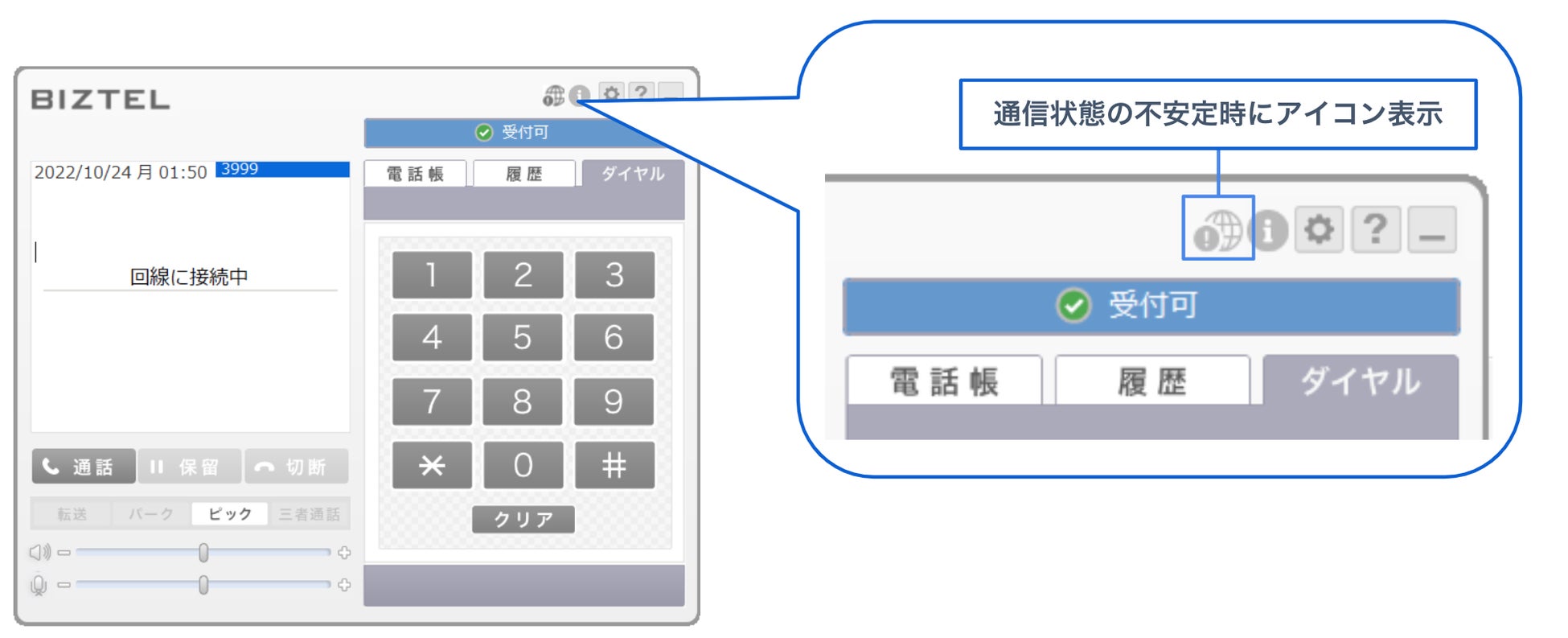 インターネット回線の不調などによってソフトフォンとBIZTELサーバの接続が不安定になった際、ソフトフォンに「ネットワーク遅延アイコン」が表示されるようになりました。