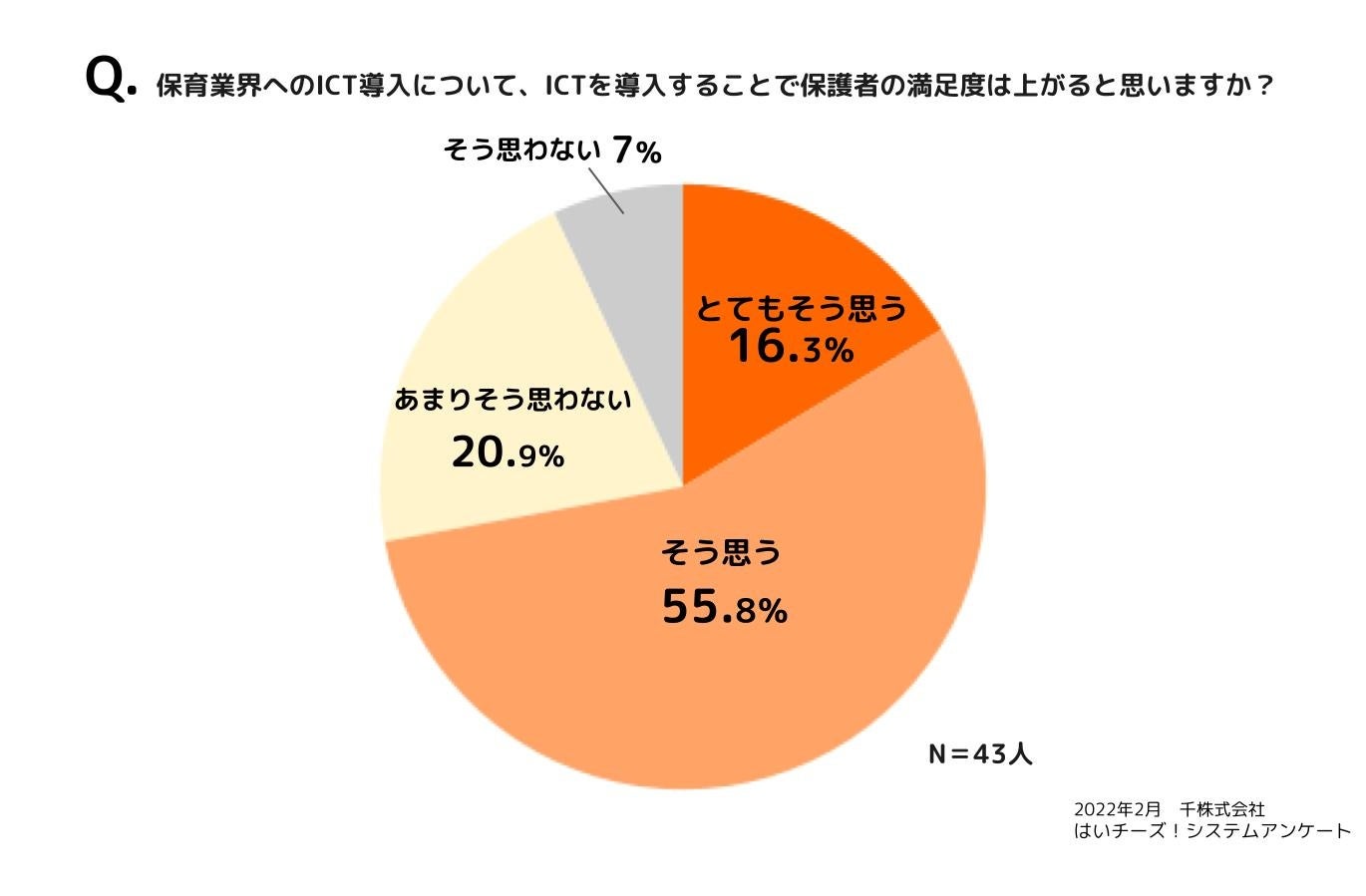保育業界へのICT導入について、『ICTを導入することで保護者の満足度は上がると思いますか?』と質問したところ、「とてもそう思う(16.3%)」「そう思う(55.8%)」「あまりそう思わない(20.9%)」「思わない(7%)」という結果となり、”そう思う合計”は72.1%となりました。この結果より、ICTを導入している保育施設の多くは、ICT導入が保護者の満足度向上に寄与していると考えていることがわかりました。