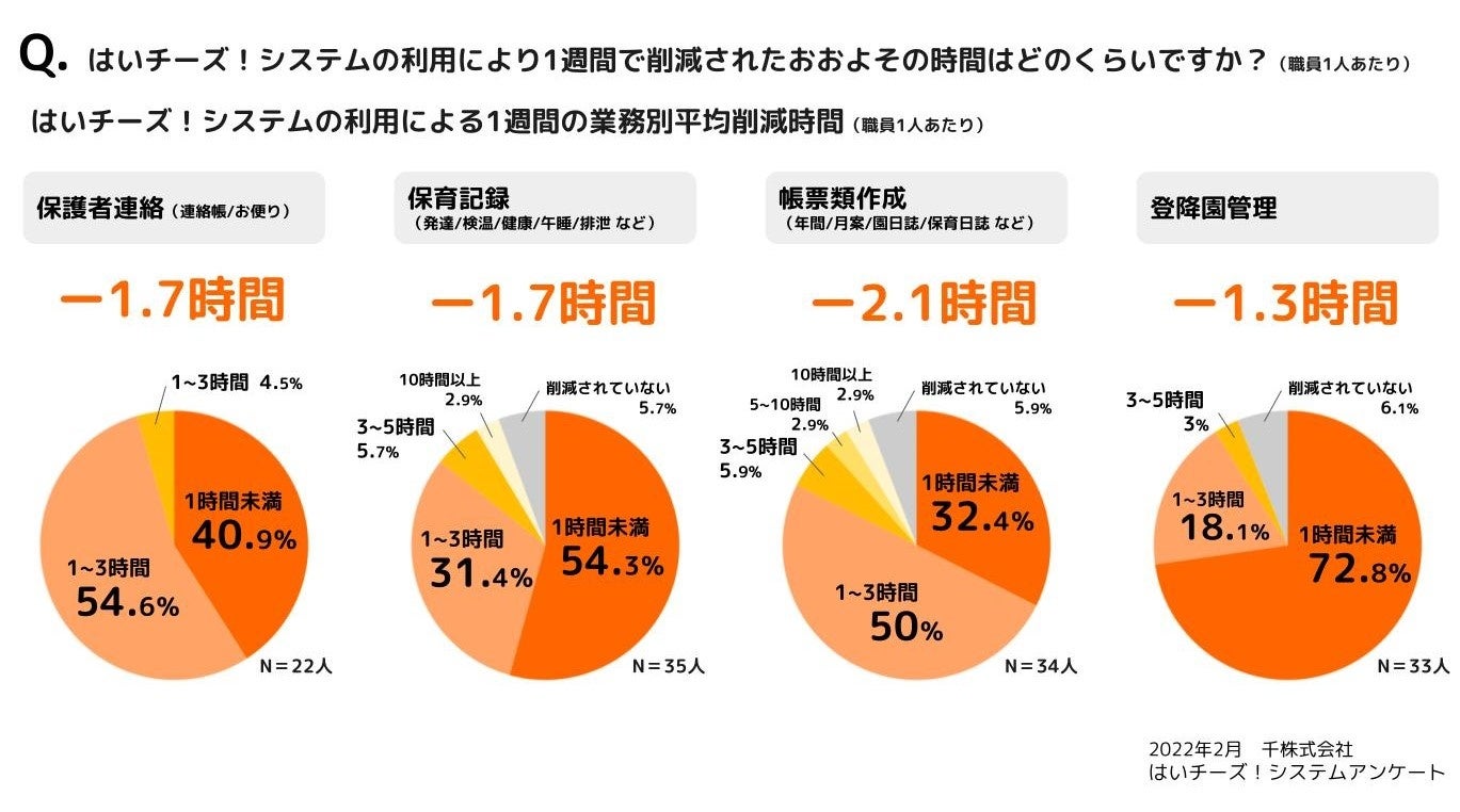 はいチーズ!システムの利用により1週間の削減時間について質問し、各業務ごとに平均削減時間を算出したところ、「保護者連絡(1.7時間)」「保育記録(1.7時間)」「帳票類作成(2.1時間)」「登降園管理(1.3時間)」という結果となりました。