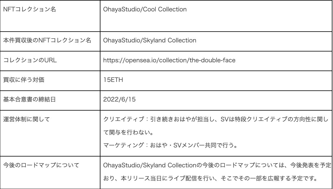 Skyland Ventures(本社:東京都渋谷区、パートナー・CEO:木下慶彦、以下SV)と、NFTクリエイターおはや @StudioOhaya (以下おはや)は、 の運営するNFTコレクション OhayaStudio/Cool Collection を買収し、共同運営体制(以下、「本件買収」という)へ移行することに関して、基本合意書を締結したことをお知らせします。