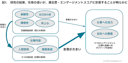結果として、性格によって仕事満足度の感じやすさに個人差があり、それがエンゲージメントスコアの高さにも影響することがわかりました(図1)。物事を前向きに(楽天的に)捉えやすく、また未知のものに興味が湧きやすい(目移りしやすい、飽きやすい)性格のほうが、サーベイにおいて仕事や職場の満足度スコアを高くつけやすく、また満足度が高いほうがエンゲージメント(やる気や会社への愛着)のスコアも高くつけやすい傾向にありました。