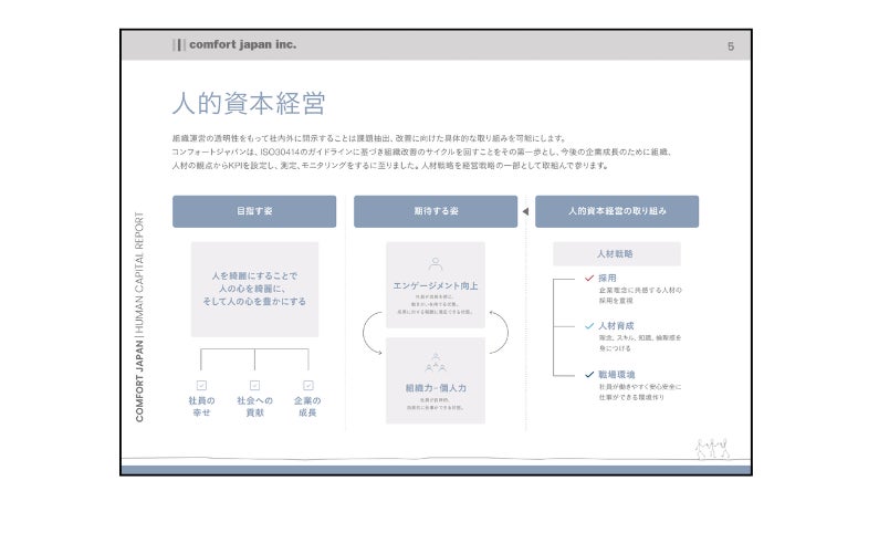 コンフォートジャパン社は、人的資本報告書「HUMAN CAPITAL REPORT 2023」の中で「組織運営の透明性をもって社内外に開示することは課題抽出、改善に向けた具体的な取り組みを可能にします。コンフォートジャパンは、ISO 30414のガイドラインに基づき組織改善のサイクルを回すことを第一歩とし、今後の企業成長のために組織、人材の観点からKPIを設定し、測定、モニタリングをするに至りました。人材戦略を経営戦略の一部として取組んで参ります」と人的資本報告書公表の目的を表明されています。