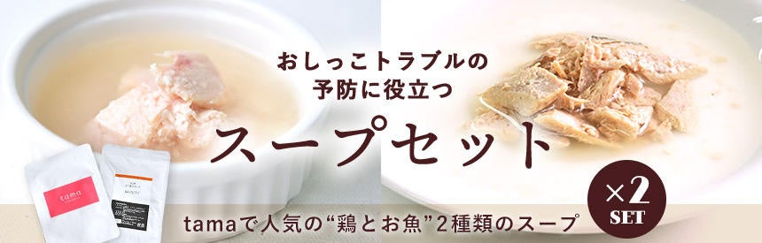 プレミアムキャットフード専門店・通販「たまのおねだり(tama)」(運営:マーケティングパートナー株式会社、本社所在地:東京都新宿区、代表取締役社長:権田真司、Tel:03-6772-8194)は、寒さが深まるとリスクが高まるとされる「おしっこトラブル」の予防に役立つ「水分補給に役立つスープセット」を、11月8日より数量限定で販売開始しました。『チキンのスープ煮 100g』と『かつおのスープ 60g』が各2個ずつがセットになって、特別価格1,210円(26.8%オフ)でのご提供となります。