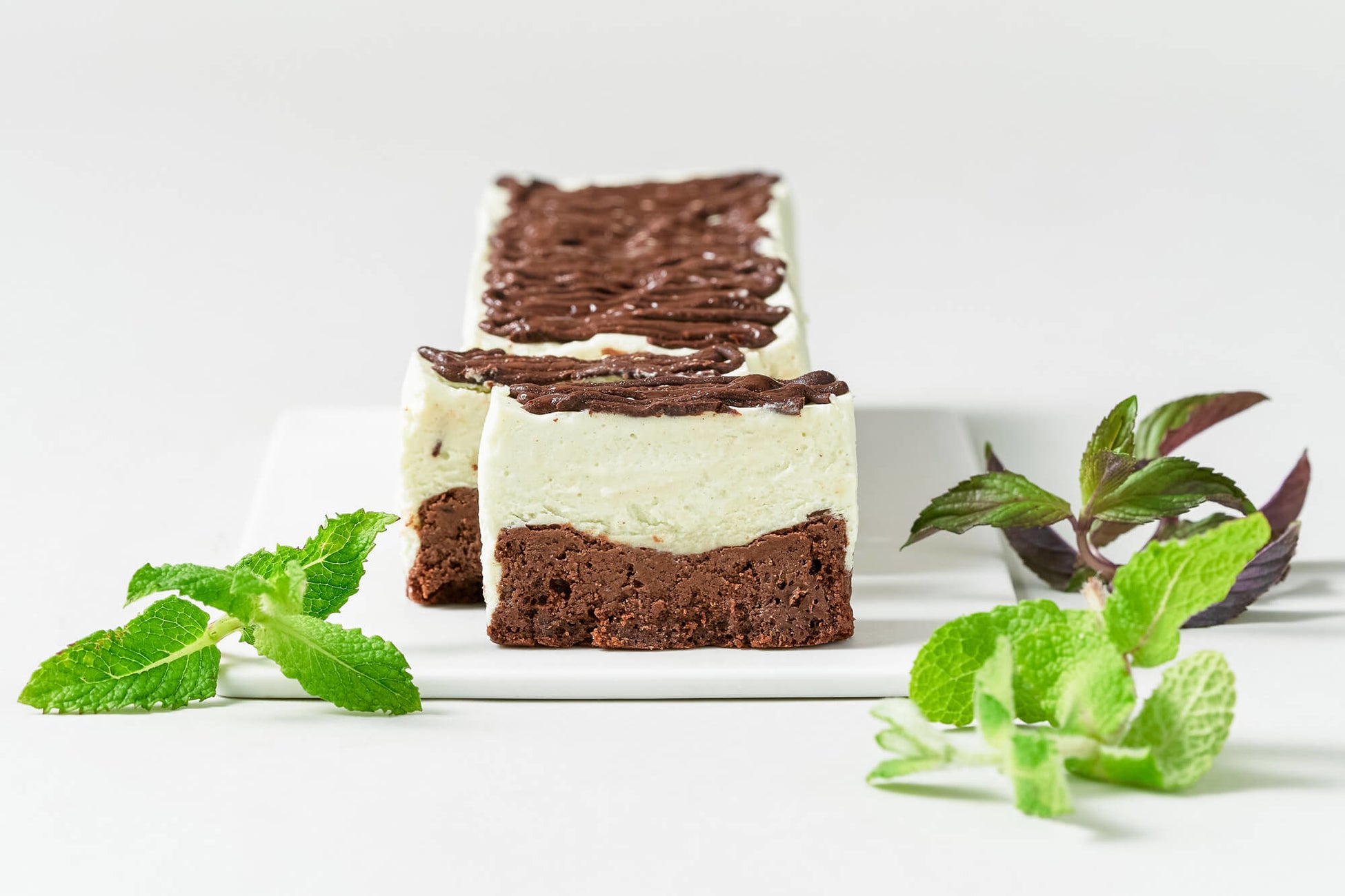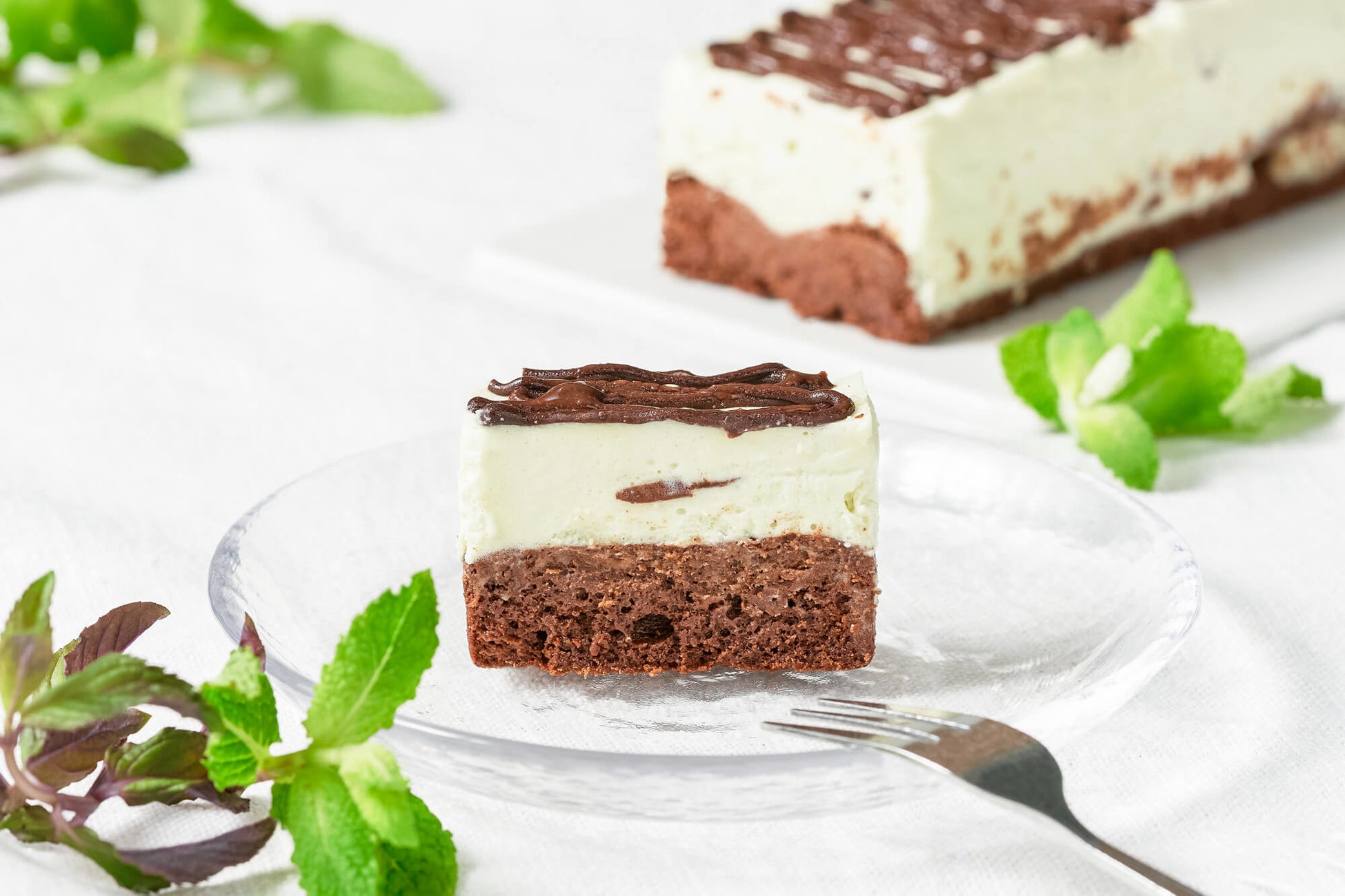 ホワイトチョコレートを使ったミントムースと、心地よいビターさで軽い口当たりのチョコレート生地の2層構成。ミントムースには、ペパーミント・スペアミント・アップルミントの3種をブレンドし、香料や着色料は不使用で素材本来の天然ミントの味わいをお楽しみいただけます。