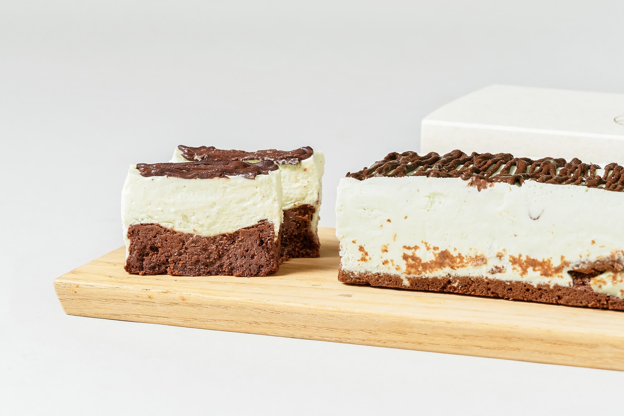 着色料を使わず仕上げたミントムースは本来の色合いである薄いグリーンです。このムースに後味スッキリとしたホワイトチョコレートを合わせました。表面のチョコレートのパリパリ食感がアクセントです。
