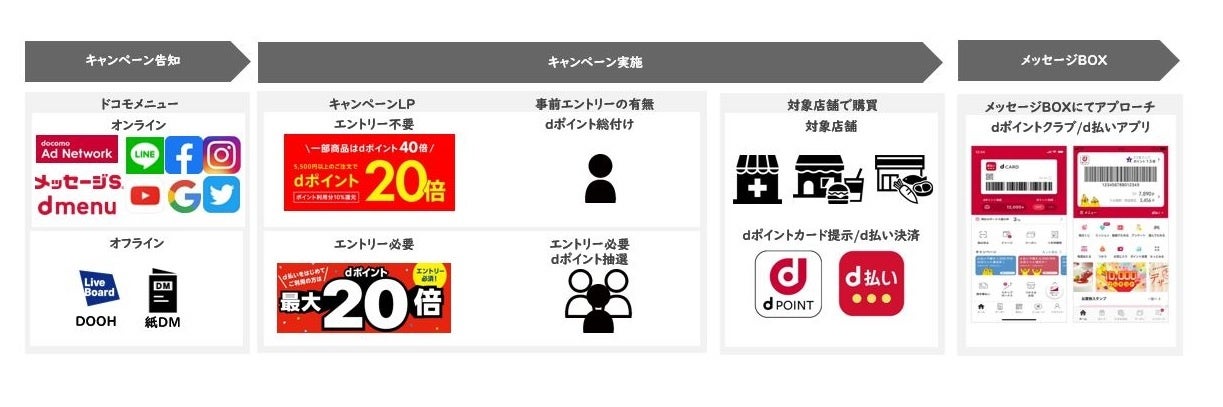 「スーパー販促プログラム」(以下、本サービス)とは、「dポイント」や「d払い®」を使い商品を購入したお客様や、キャンペーンにエントリーしたお客様へ、企業のメッセージやキャンペーン情報などを配信できる販促プラットフォームです。購買情報やキャンペーンエントリー情報に基づくターゲティングが可能となるため、従来のプロモーションでアプローチすることが難しかった、購買により近しいお客様への直接的な接点構築をお手伝いします。