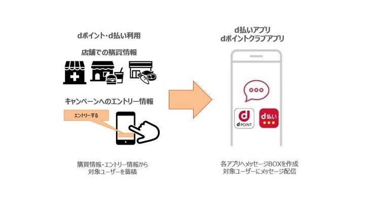 本サービスは、キャンペーンへのエントリー情報・購買情報からユーザー基盤を作成し、お客様の「dポイントクラブ」アプリや「d払い」アプリへ企業からのメッセージを配信することができます。お客様の年齢、性別、地域といった属性から対象を選定することにより、ターゲットに適した再来店や再購買を促すことが可能となります。