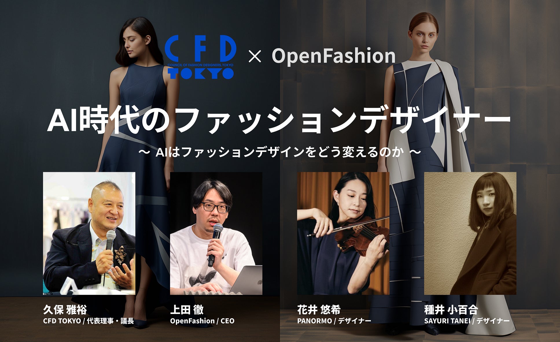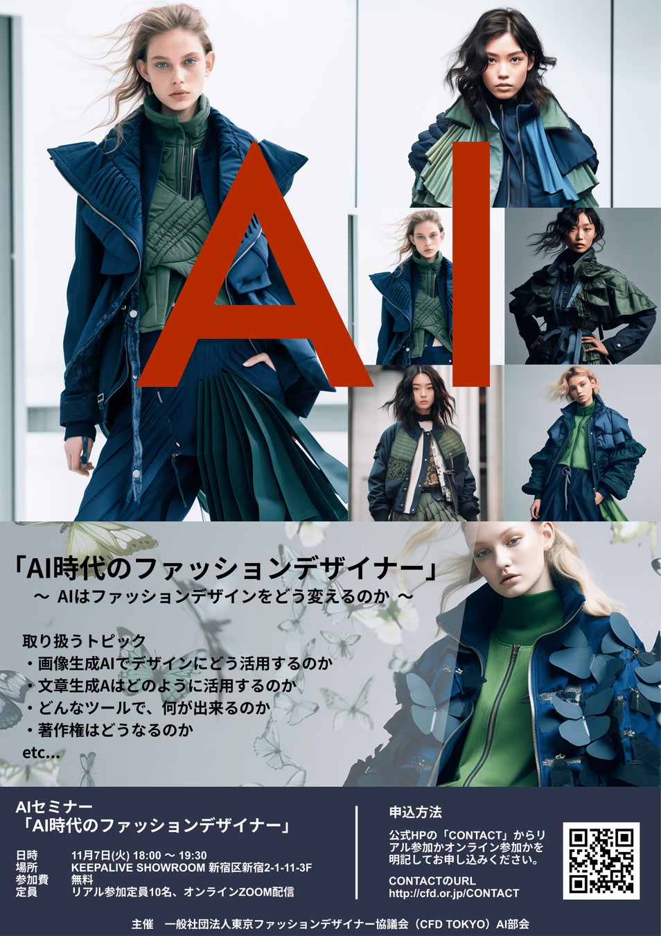 11月7日(火)18時よりオンライン・オフライン同時で無料開催するセミナー「AI時代のファッションデザイナー~AIはファッションデザインをどう変えるのか~」は、“AI時代のファッションデザイナー”というテーマで、OpenFashion社代表 上田が登壇。「ChatGPT」や「Midjourney」などの生成AIサービスを耳にするがどのように活用すればいいのかわからない、AIでの制作物に対して今の日本では著作権についてどのようになっているのか、など気になることにも回答します。さらに実際に生成AIツールを活用したデザイン制作のデモンストレーションを実施予定です。