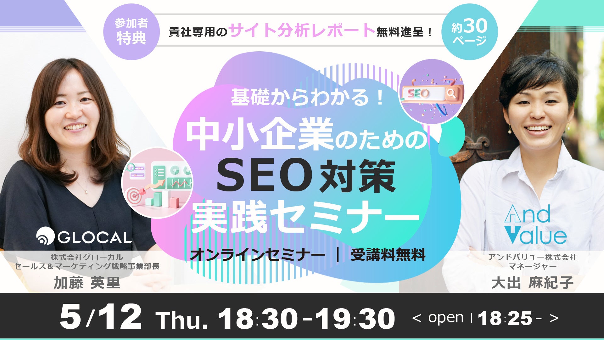 地域の中小・中核企業を対象に経営コンサルティング事業を行う株式会社グローカル(東京都渋谷区、以下グローカル)は、中小企業の経営者やマーケティング責任者を対象に、自社サイトの検索エンジンでの上位表示を図るSEO対策について解説する無料オンラインセミナーを、2022年5月12日(木)18:30から開催します。