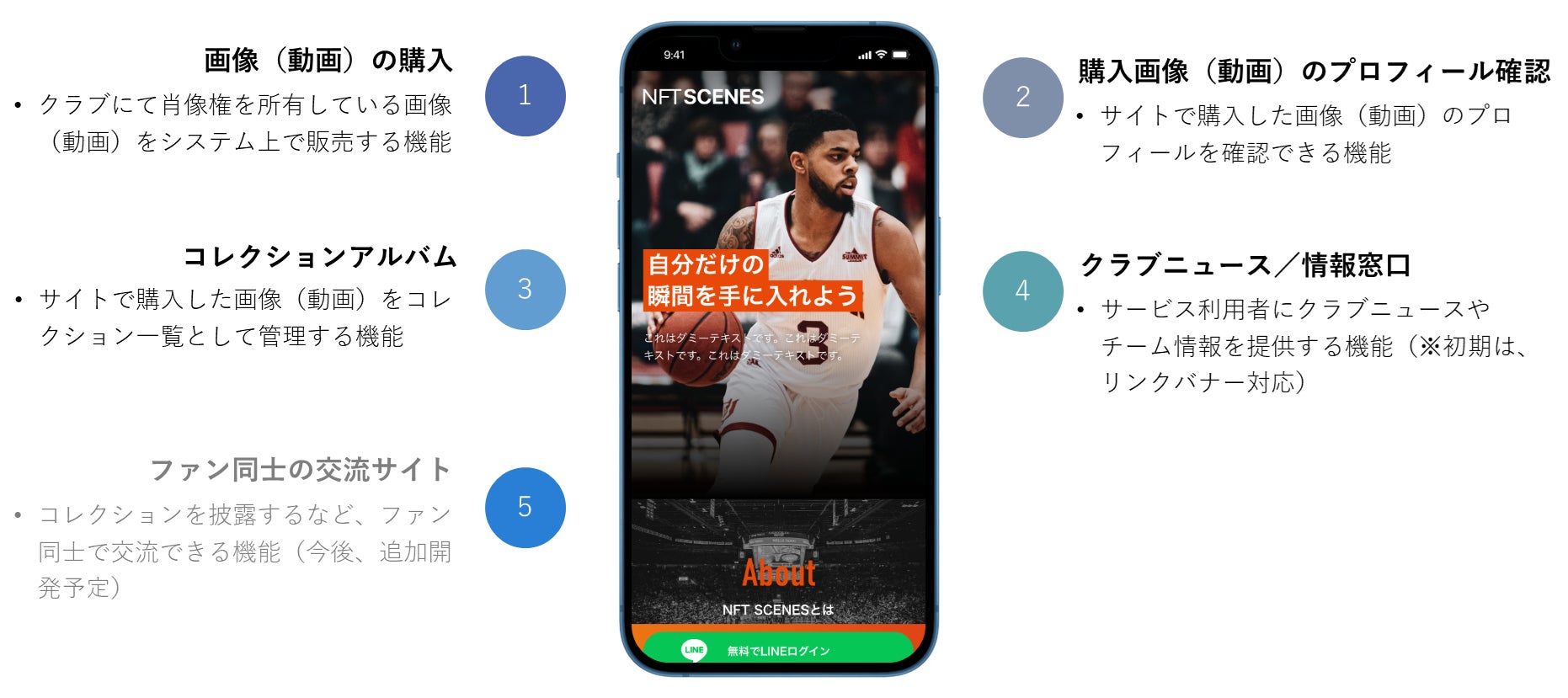 基本機能としては、クラブが肖像権を所有しているNFTコレクションの購入機能、ファンがサイトで購入したコレクションを会員同士で売買できるコレクションマーケット機能、また、コレクションを披露するなどファン同士で交流できる機能(今後、実装予定)、サイトで購入したコレクションを一覧として管理できるコレクションアルバム機能、クラブニュースやチーム情報を配信するクラブニュース機能、 購入した選手のプロフィール閲覧機能などを搭載しています。
