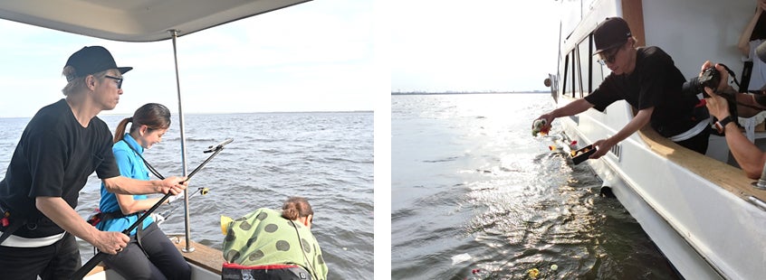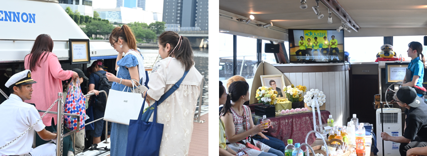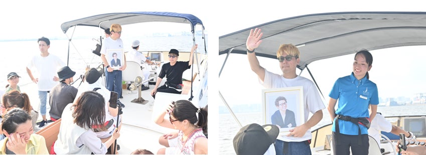 最後は実際に船に乗って体験する海洋散骨です。中央区勝どきの船着場前でバスを降りた参加者はクルーザーに乗り込み、散骨ポイントである東京湾羽田空港沖に向かって出発。船内には田村淳さんの写真が飾られ、仮想のセレモニーが進行されていきます。船内のモニターから田村淳さんのメモリアルビデオが上映されると、参加者だけでなくご本人も目を潤ませる姿が見られました。