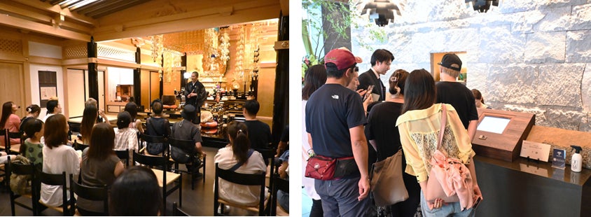 その後はエントランスへ戻り、受付機で参拝室を選択。指定の参拝室へ移動すると、ご遺骨を納めた厨子が自動的に参拝室へ運ばれており、個室の中でゆったりと故人を想いながら手を合わせることができます。実際に見学してみて、「自動搬送式」という言葉から受ける機械的な印象が変化した方も多いようで、田村淳さんは「(自分の行先は)海洋散骨って決めていたけど、これもいいね」と好印象のご様子。