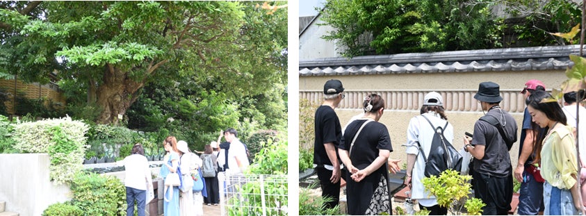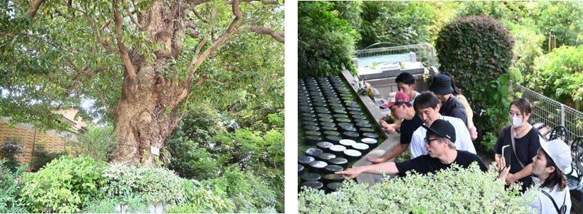 最初の見学先はJR日暮里駅からほど近く、風情ある下町に佇む長明寺境内に作られた「谷中樹陵 久遠」です。都会の中にもかかわらず、緑豊かな樹木葬庭園と大きなシンボルツリーが特徴的で、樹木葬のイメージを膨らませるのにぴったりの場所として今回見学先に選ばれました。降り注ぐ日差しの下で整えられた植栽と木々が青々と輝くなか、スタッフの案内のもと3グループに分かれて庭園内を見てまわります。