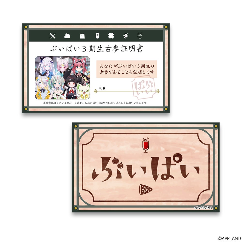 【ぶいぱい3期生 スターターグッズ】の商品を1回の会計につき税込5,000円(送料除く)以上お買い上げいただくと「ぶいぱい3期生古参証明書」を1枚プレゼント!