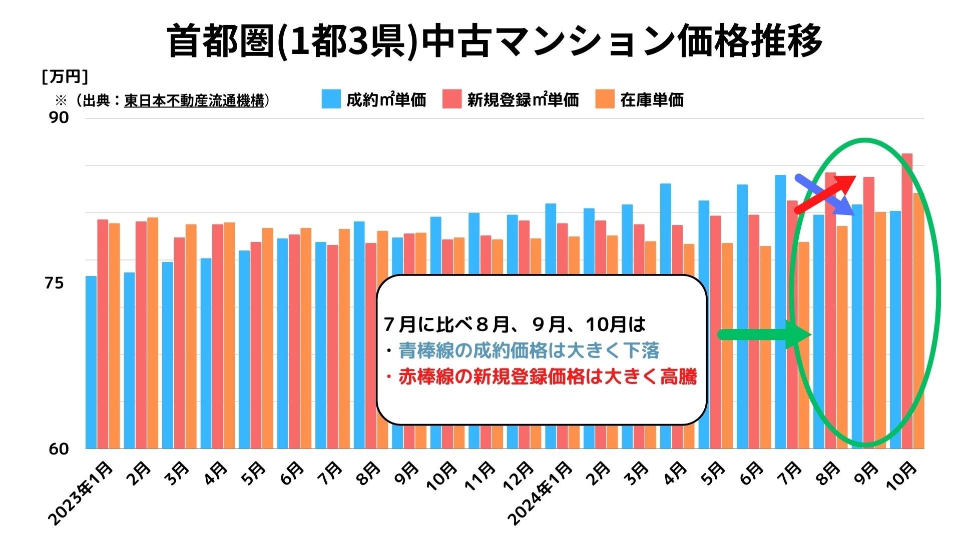 2024年10月レインズタワー月例速報によると一都三県中古マンション成約平米単価は、2024年7月を天井として、8月、9月、10月はやや低い水準にとどまりました。(グラフ1参照)。マンションリサーチ株式会社では本現象の実態と構造を調査しました。