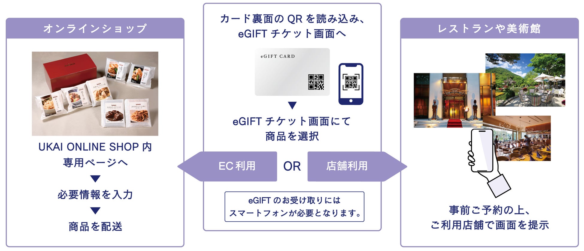「うかい eGIFT」は、うかいのオンラインショップや一部のレストランでご利用いただけるチケットをお客様がPCやスマートフォンを使って購入し、メールやSNSなどを通じて送ることができるデジタルギフトです。また、カードタイプはうかいグループのレストランでお買い求めいただけます。初回ラインナップは、ご自宅でうかいの味わいを楽しむことができるうかいグルメデリの冷凍食品や、行楽にぴったりな箱根ガラスの森美術館の入館券・ガラス体験・お食事のセット、うかい鳥山やグリルうかい 丸の内店などのレストランでご利用いただけるペアお食事券など5券種をバリエーション豊かにご用意しました。