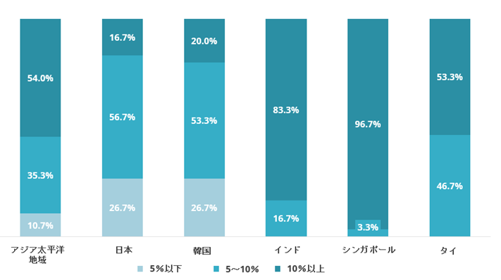 本調査では、重要なワークロードについても質問しており、日本からの回答では、創薬(40%)、診断用ゲノミクス(20%)、精密医療(20%)が上位となり、タイを除く3か国でも上位3つは同様の結果となっています。また、日本の回答者の56.7%が年間のゲノミクスワークロードが今後2年間で5~10%増加すると予測しており、さらに16.7%の企業は10%以上増加すると考えています。APAC地域全体で見ても5%以上の増加を見込むと答えた回答者が89.3%おり、特に10%以上の増加を見込む回答者がインドで83.3%、シンガポールで96.7%と、ゲノミクスの拡大の勢いがうかがえます。(図2参照)加えて、日本の回答者の半数(50%)が、データストレージと演算リソースに対する年間支出額についても、今後2年間で5~10%の増加を見込んでいます。必要なストレージ量の増加が予想される一方で、データ演算、ストレージ、保守/サービスに年間100万ドル以上を支出している企業は、日本では10%程度にとどまります。
