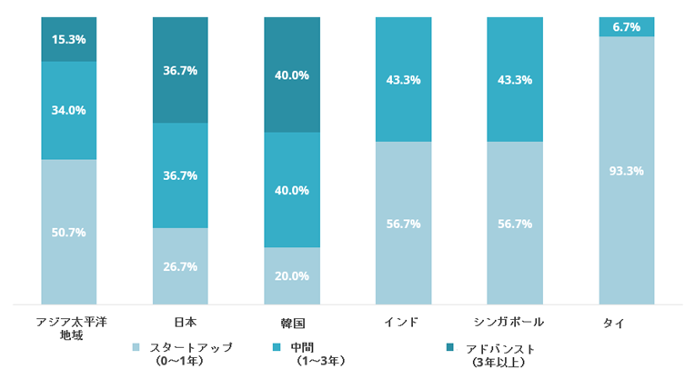 パンデミックに伴うイノベーションの加速は、APAC地域のヘルスケア業界の追い風となっているものの、創薬・ワクチン開発や精密医療の鍵となるゲノミクス用ハイパフォーマンス・コンピューティング(HPC)インフラストラクチャの運用においては、APAC地域の約半数(50.7%)が未だ初期段階(1年未満)であることが判明しました。一方で、日本ではゲノミクス用HPCインフラストラクチャの運用において、「1年以上~3年未満」および「3年以上」の実績を持つと回答した企業が73.4%おり、韓国(80%)と共に他の調査地域をリードしています。(図1参照)